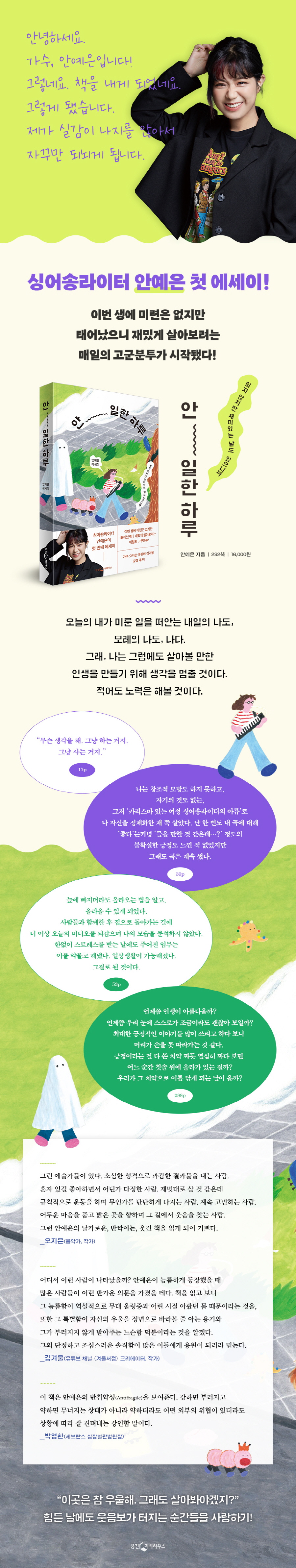 지하철에서 읽다가..뒤로갈수롯 눈물이 차올라서 고갤들었어요 눈에 썬크림 들어가면 예은양이 책임지세요ㅠㅠ 안예은님의 노래 언제나 기쁘게 듣고있었는데, 에세이가 나온줄은 몰랐습니다. 제목부터 예사롭지 않다 생각 했었는데, 첫페이지의 첫 문장에서부터 이마를 쳤어요 정말이지 당신이란 트위터인간...정말 최고야 멋있어. 읽을수록 더더다 응원하게 되었습니다. 예은님의 앞으로 행보 늘 응원할게요