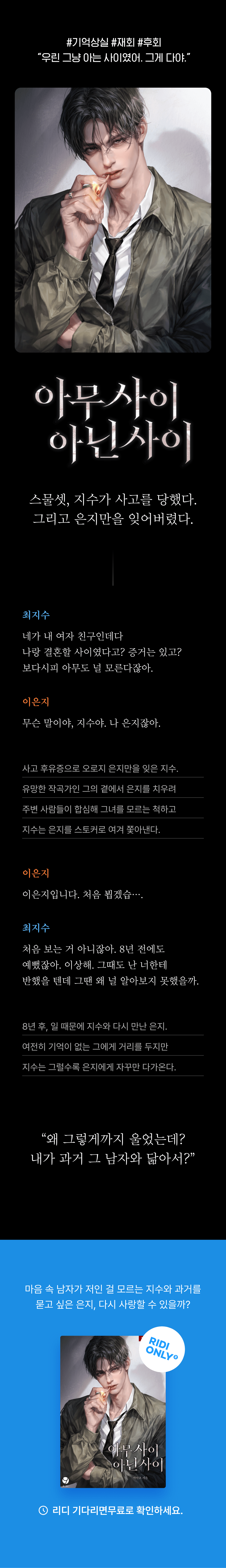 막장드라마 같은 남주 주변인물 설정에 이별 후 재회하는 스토리네요ㅎㅎ 근데 여주 예전에 연애할 때도 힘들었는데 다시 또 만나도 안힘들까 어쩌려나...