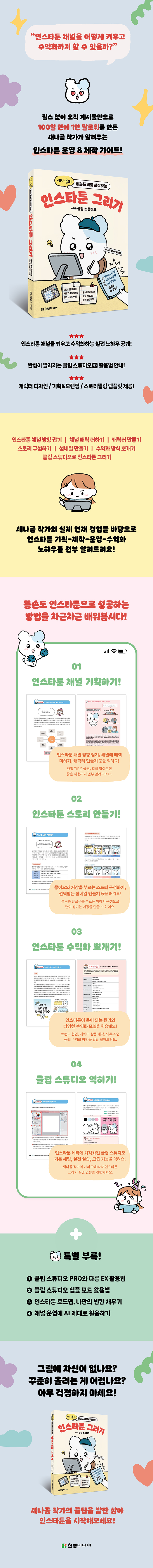 이 책에는 클립 스튜디오 활용법과 함께, 단순히 ‘잘 그리는 방법’보다 재미있는 스토리텔링 기법을 통해 ‘콘텐츠를 설계하는 방법’을 담았습니다. 또한 연재를 지속하며 수익화를 실현하는 실전 노하우를 담았습니다. 인스타툰을 단순한 취미를 넘어 하나의 콘텐츠 자산이자 업으로 삼고 싶은 분들에게 이 책이 현실적인 가이드가 되길 바랍니다.