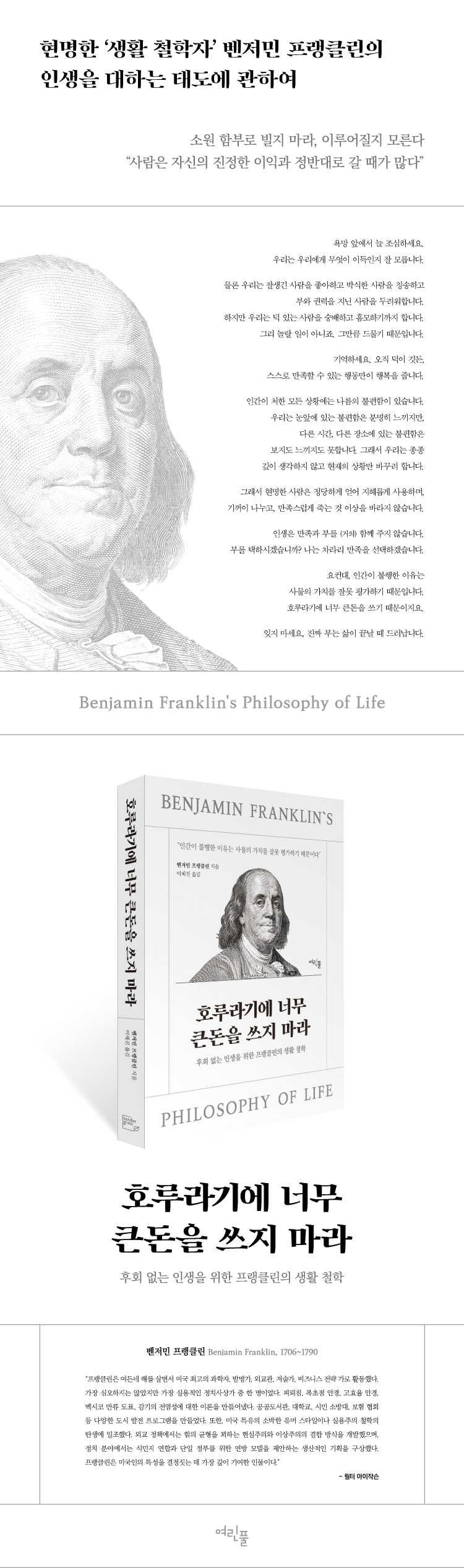 벤저민 프랭클린은 보통 ‘미국 건국의 아버지’, ‘피뢰침 발명가’ 등으로 기억되지만, 그의 진가는 어떤 상황에서도 더 나은 자신을 만들기 위해 노력했던 ‘인생을 대하는 태도’에 있다. 그는 누구보다도 실용적이면서 깊이 있는 통찰로 인생을 바라본 인물이다. 그래서 그는 18세기의 언어로도 충분히 21세기를 사는 우리에게 놀랄 만큼 현대적인 질문을 던질 수 있었던 것이다. “그대는 어떻게 살아야 할지 아나요? 무엇이 진짜 이득이고, 무엇이 진짜 손실인지 그대는 정말 아나요?” 《호루라기에 너무 큰돈을 쓰지 마라》는 프랭클린이 남긴 자서전, 에세이, 편지, 잠언, 칼럼 등에서 ‘생활 철학’이라는 기준으로 글을 가려 뽑아 엮은, 후회하지 않는 인생을 위한 ‘생활 철학서’이다.