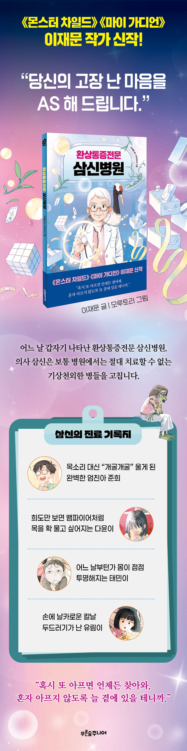 《몬스터 차일드》와《마이 가디언》으로 재미와 깊이, 감동을 선사해 온 이재문 작가가 이번에는 ‘병원’을 배경으로 판타지 동화를 선보인다. 원인을 알 수 없는 통증, 즉 ‘환상통증’을 앓는 아이들은 백발의 의사 삼신이 운영하는 신비한 병원을 찾는다.
