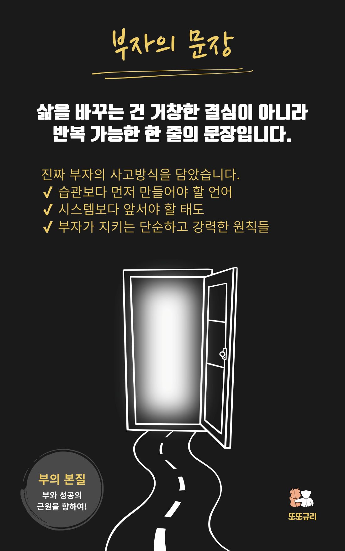 부와 성공은 단순한 기술이 아니라 ‘삶을 이끄는 문장’에서 시작된다는 믿음으로, 문장의 힘을 탐구한다.