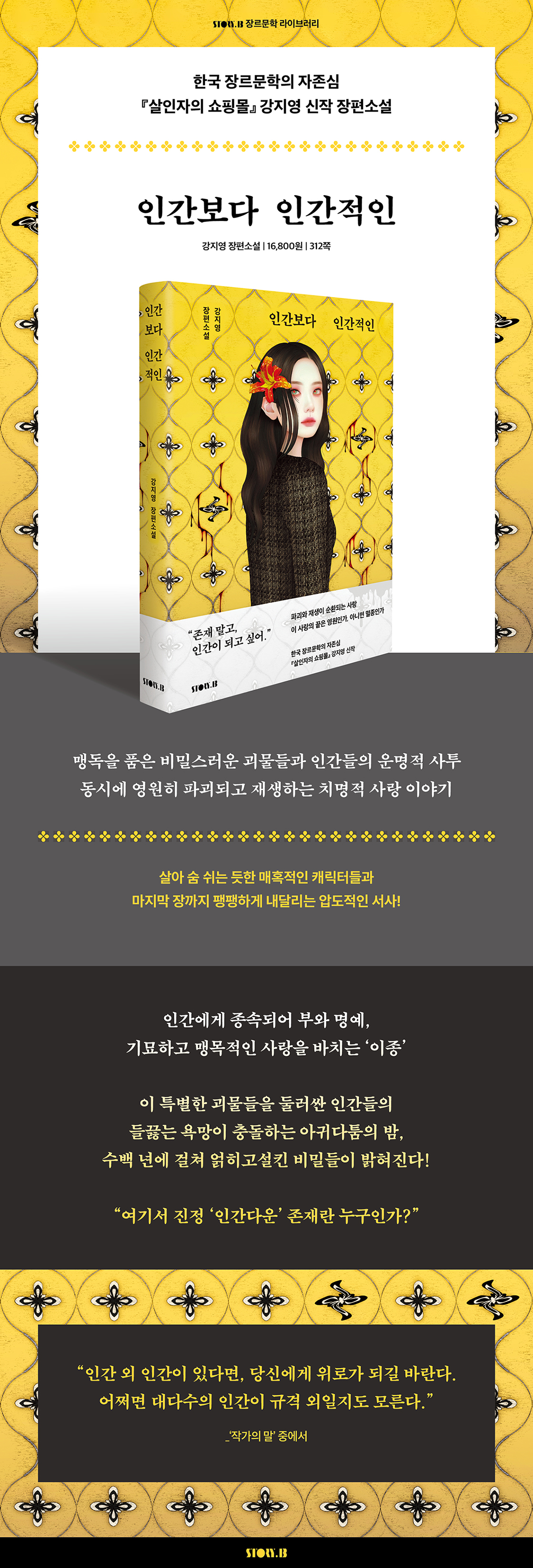 미스터리, 스릴러, 누아르, 판타지 등 폭넓은 영역을 넘나들며 한국 장르문학계의 손꼽히는 스토리텔러로 활약해온 강지영 작가의 신작 장편소설이 STORY.B에서 출간됐다. 『인간보다 인간적인』은 현대 서울을 배경으로, 매력적인 캐릭터성을 갖춘 ‘크리처’들이 등장하는 판타지 스릴러이자, 동시에 기묘하고도 절대적인 사랑과 인연의 이야기를 담아냈다. 강지영 작가 특유의 박진감 넘치는 문장들, 마지막 장까지 팽팽하게 내달리는 압도적인 서사로 독자들을 책장 속으로 끌어당기는 한편, 인간과 인간이 아닌 존재들을 내세워 ‘인간다움’에 대해 다시 한번 생각하게끔 만든다. 강렬한 개성을 갖춘 캐릭터들의 숨겨진 서사가 얽혀들며 클라이맥스로 내달리는 속도감 가득한 스토리텔링을 선보이며 독자들에게 텍스트에 몰입할 때만 느낄 수 있는 순수한 ‘읽는 재미’를 선사한다.