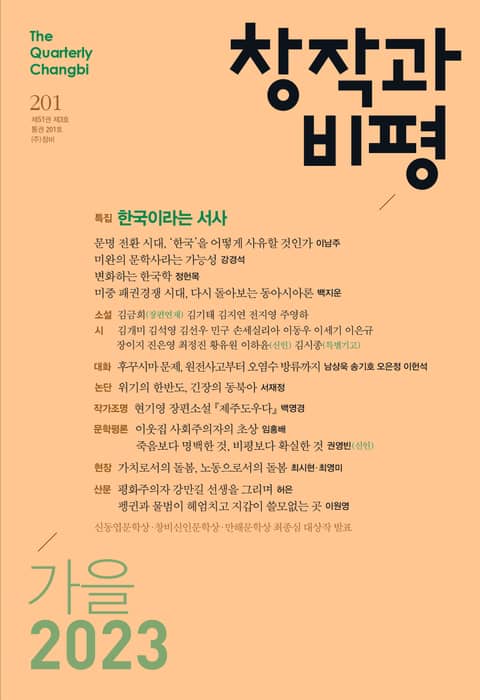 『창작과비평』 2023년 가을호는 200호를 갈무리하고 새로운 출발점에 서는 마음으로 대전환을 향한 실천적 과제를 고민하는 종요로운 글들을 묶어 낸다. 특집에서는 ‘한국이라는 서사’라는 주제 아래 최근 정치, 문화 등 다방면으로 새로운 흐름을 만들어내며 세계적 주목을 받고 있는 ‘한국’을 어떻게 사유할 수 있을지 사회정치, 문학사, 한국학, 동아시아론을 거쳐 다각도로 점검한다. 후꾸시마 오염수 방류에 관한 실질적 쟁점을 짚은 대화와 군비경쟁 및 핵전쟁의 위험 속 한반도 평화를 고민하는 논단 역시 급변하는 세계적 흐름 앞에 선 우리에게 유의미한 질문을 던진다. 역사학자 고 강만길 추모 산문과 동물행동학자 이원영의 ‘내가 사는 곳’ 산문 및 가사노동자 권리 투쟁의 생생한 목소리를 담은 현장란도 풍성하며, 제주와 한국 현대사를 아우르는 역작 『제주도우다』의 작가 현기영의 인터뷰도 눈길을 끈다.