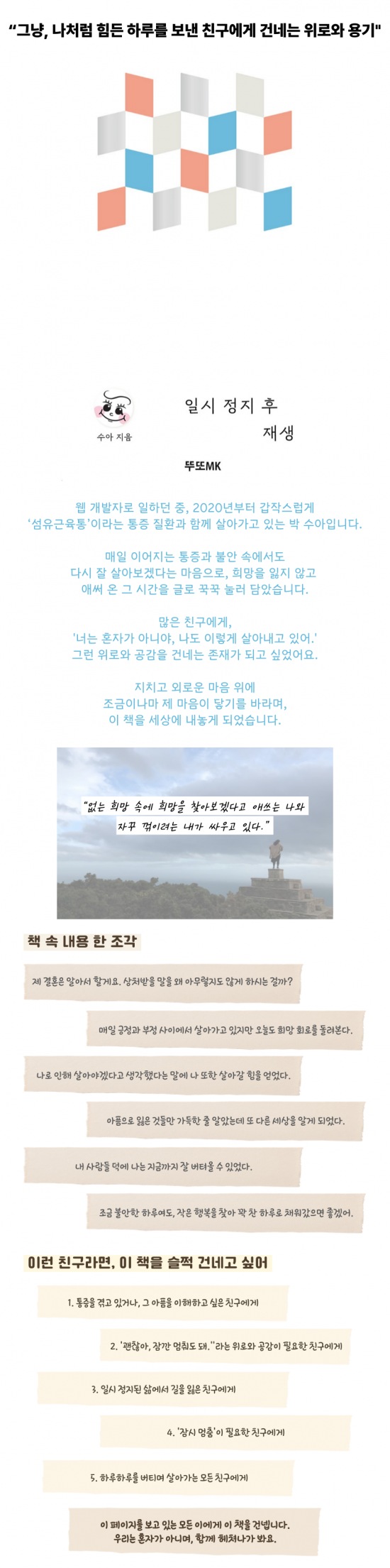 끝없는 통증과 불안 속에서 “나 같은 사람도 누군가에게 위로가 될 수 있을까?”라는 물음이 글쓰기로 이어졌고,