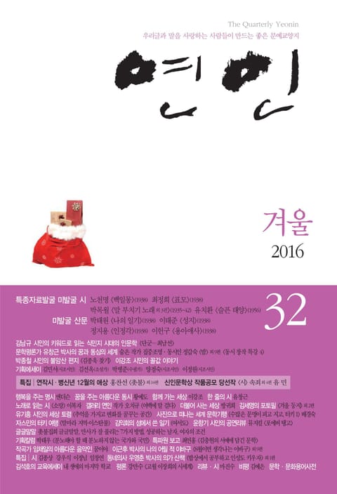 연인 2016년 겨울호(통권 32호)를 발행합니다. 흰 눈처럼 더욱 하얗고 따뜻한 겨울날만 되시고, 소망하는 모든 일들 다 이루시는 새해 되시길 기원합니다.
