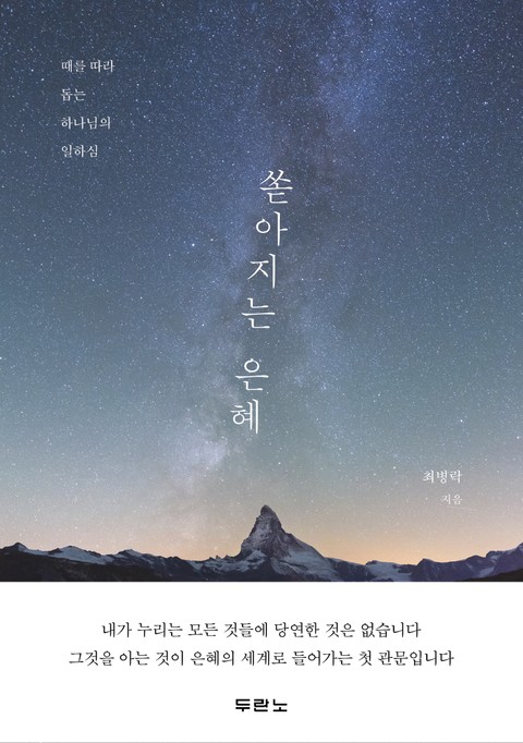 이 책이 그리스도인에게 보내는 하나님의 위로의 편지가 되기를 바라고, 시마다 때마다 쏟아지는 은혜를 주신 하나님께 드리는 감사의 고백이 되기를 원한다는 저자의 고백대로 은혜를 묵상하고, 나누고, 은혜로 삶을 보려는 이들에게 따뜻한 묵상집이 될 것이다.