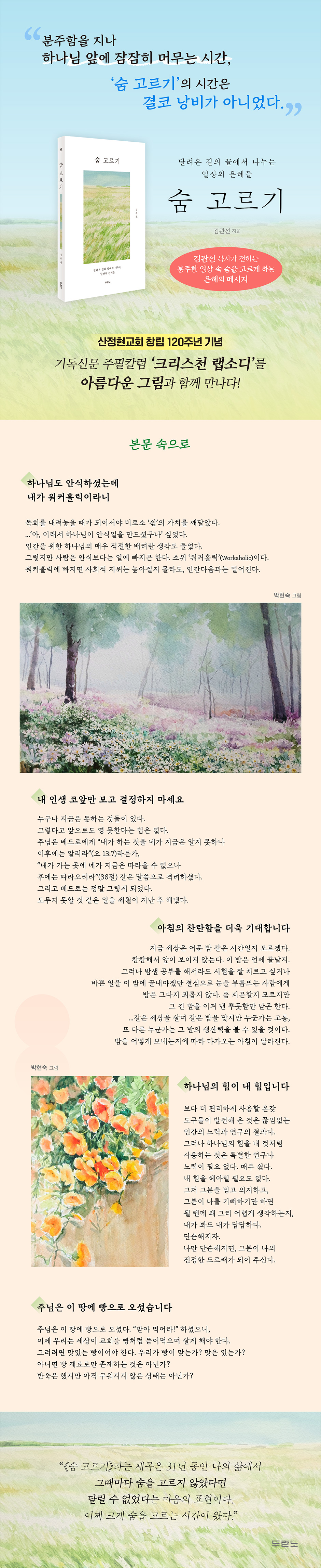 이 책은 산정현교회 창립 120주년을 맞아 31년간 한 교회를 섬긴 저자가 은퇴를 앞두고 성도들에게 건네는 고백의 기록이다. 은퇴를 기념하기보다 오랜 시간 동행해 준 성도들에게 전하는 감사의 마음이며, 쉼의 자리에서 다시 하나님을 바라보는 신앙의 고백이다. 이 책에 실린 문장들은 누구를 가르치려 들지 않는다. 대신 조용히 말을 건다. 바쁜 하루 속에서 놓쳐온 것들, 열심이라는 이름으로 지나쳐 온 마음들, 그리고 그 모든 시간 속에서도 늘 곁에 있었던 하나님의 은혜를 담담히 되짚는다.