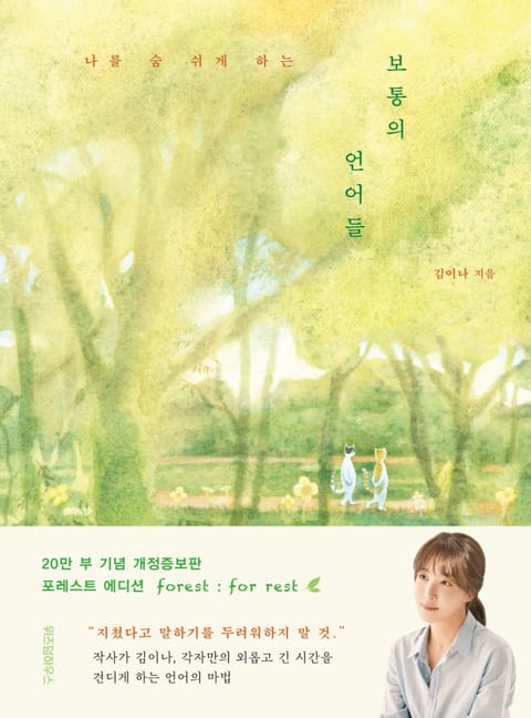 『보통의 언어들』은 김이나 작가가 대중과 긴밀히 소통해온 경험을 살려, 삶에서 부딪히는 감정과 관계의 고민을 일상의 단어 속에서 탐색한 책이다. 출간한 지 6개월 만에 10만 부를 돌파했고, 3년 만에 20만 부 판매의 기록을 세운 스테디셀러이다. 『보통의 언어들』은 ‘언어’를 통해 자신만의 생각을 단단하게 세우고 흔들림 없는 삶의 태도를 유지하고 싶은 사람들을 위한 책이다. 평범한 단어들 속에 깃들인 특별한 가치를 찾고 삶의 지향점을 풀어가는 작가의 글은 쳇바퀴 같은 하루가 얼마나 소중한 것인지, 그 안에서 우리는 어떻게 확장된 인생의 의미를 발견할 수 있는지 보여준다. 20만 부 기념 포레스트 에디션에서는 유해한 말에서 멀어지고, ‘나를 숨 쉬게 하는’ 무해한 생각들로 나 자신에게 위로를 건네는 법에 대해 생각하게 한다. 지친 일상에 위안을 얻었다는 많은 독자들의 말처럼, 고단한 하루를 다정한 빛깔로 채워가는 언어의 마법을 경험하게 될 것이다.