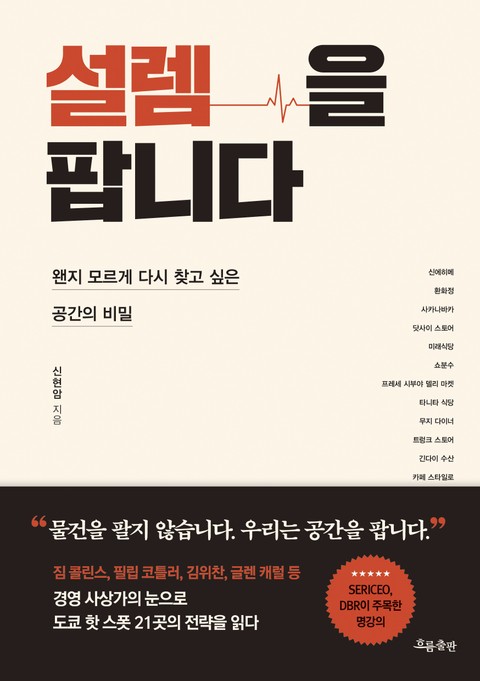 《설렘을 팝니다》의 저자는 신에히메, 미래식당, 환화정 등 도쿄의 21개 공간을 분석해, 다시 찾고 싶은 공간에 숨겨진 비밀을 파헤치고, 소비자의 마음을 사로잡는 설렘 전략을 소개한다. 창업가, CEO, 경영 전략가의 눈으로 ‘가고 싶은 곳, 가지고 싶은 것’의 비밀을 읽어보자.