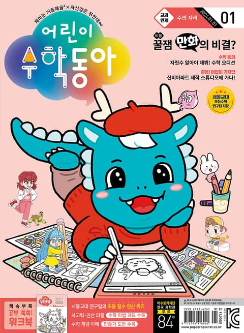 꼬마 용이 즐거운 표정으로 그림을 그리고 있어요. 주변에는 귀여운 캐릭터들이 모여 있는데, 다들 어디에서 온 걸까요? 만화의 비밀을 알려주는 특별한 수학 기사, 새로운 캐릭터들이 등장하는 꿀잼 수학만화를 함께 즐겨 봐요!