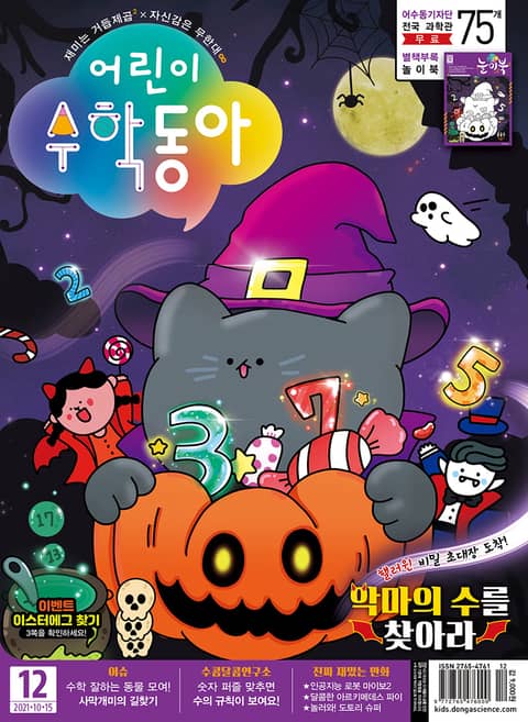 핼러윈에 나타난 귀여운 검은고양이가 호박 바구니를 내밀며 ‘트릭 오어 트릿(Trick or Treat)’을 외쳐요. “과자를 안 주면 장난칠 거예요!”라며 사탕을 받아 가는 놀이예요. 핼러윈에 어울리는 신비한 수 이야기가 궁금하다면 8쪽을 확인하세요!