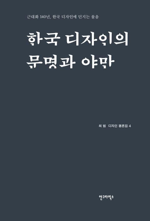 한국 근대화 140년, 한국 디자인에 던지는 물음강화도 조약을 기점으로 한국이 근대화를 맞은 지 140년이 된 지금, 디자인 평론가 최 범이 한국 디자인에 던지는 네 번째 물음. 화려한 근대화 문명 뒤에 세월호 참사라는 야만적인 사태가 공존하는 한국의 모습에서 최 범은 그것이 한국 디자인의 모습과 같다고 한다. 수많은 디자인 제도와 디자인학과가 존재함에도 근대 세계 질서는 한국을 좀체 디자인 선진국 반열에 오르는 것을 허용하지 않는다. 이러한 한국 디자인의 아이러니 속에서 최 범은 묻는다. “과연 근대화 과정에서 한국 디자인은 문명의 얼굴을 더 많이 보여주었는가, 아니면 야만의 표정을 더 많이 지었는가.” 이 물음에 한국 디자인은 국가주의적 구호와 대기업 중심으로부터 해방되어 개개인의 구체적인 삶에 들어갈 수 있을까.
