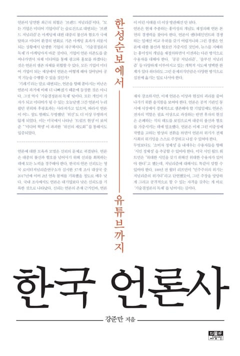 강준만 교수는 ‘언론사’가 가장 재미있고 유익한 과목이 될 수 있으며 되어야 한다고 믿는 언론학자다. 『한국 언론사』는 이런 생각에 기반해 집필한 책이다. 강준만 교수는 ‘사회를 짙은 어둠 속에 놔두지 않고 언론 관련 사건의 맥락을 제시해주는 방식’으로 이 책을 집필했다. 이 책에서는 사회를 짙은 어둠 속에 놔두지 않으면서도 언론 중심으로 압축했다. 강준만 교수가 『한국 언론사』를 집필하면서 가장 신경을 쓴 것은 ‘객관성’이다. 책을 집필하는 내내 ‘주관’을 어느 정도 반영할 것인가 하는 고민을 멈추지 않았던 저자는 ‘객관성’을 위해 책의 구성까지 손보았다. 처음엔 각 장을 정권별로 나누지 않고 큰 흐름 중심으로 시대적 특성에 맞게 분류하고 그 특성을 표현하는 제목을 붙이는 시도를 하기도 했지만, 그런 분류에 왜곡의 소지가 있을 수도 있다는 판단을 내리고 정권별 분류를 유지하면서 ‘객관’과 ‘공정’을 중시하는 기록에 충실하기로 한 것이다. ‘객관’과 ‘공정’은 영원히 도달할 수 없는 이상이지만, 『한국 언론사』는 가능한 한 그 이상에 근접하고자 애를 쓴 책이다.