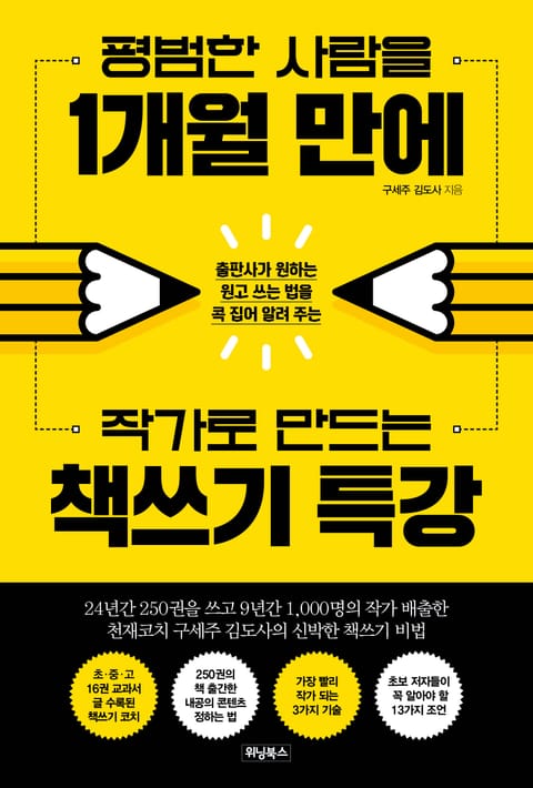 이 책 『평범한 사람을 1개월 만에 작가로 만드는 책쓰기 특강』의 저자 ‘구세주 김도사’는 24년간 250권의 책을 집필하고, 9년간 ‘한국책쓰기1인창업코칭협회(한책협)’를 운영하며 1,000명이 넘는 작가, 코치, 1인창업가를 배출했다. 책쓰기 코칭계의 구루라고 불리는 그는 “평범한 사람일수록 책을 써야 한다.”고 강조한다. 저자 또한 흔히 말하는 ‘스펙’이랄 것도 없던 상황에서 책을 펴냄으로써 자신을 특별하게 브랜딩해 최고의 전문가로 인정받고 있기 때문이다. 원고 쓰기부터 출판 계약까지 1개월 만에 이루어 내고, 코치, 강연가, 1인 기업가가 되는 원리와 비법, 노하우를 알고 싶다면 이 책 『평범한 사람을 1개월 만에 작가로 만드는 책쓰기 특강』을 반드시 만나 보자.
