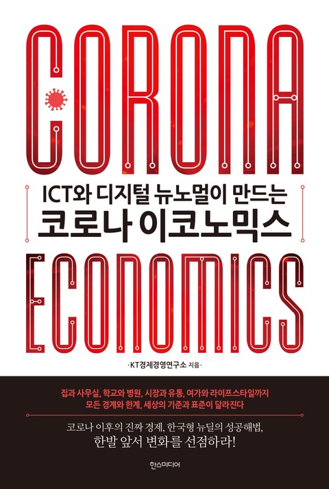 집과 사무실, 학교와 병원, 시장과 유통, 여가와 라이프스타일까지모든 경계와 한계, 세상의 기준과 표준이 달라진다코로나 이후의 진짜 경제, 한국형 뉴딜의 성공해법,한발 앞서 변화를 선점하라!코로나19 사태는 이미 예정되어 있던 디지털 뉴노멀 시대를 더욱 빠르게 앞당겼고, ‘언택트’로 대표되는 포스트 코로나 시대에서 ICT의 중요성은 한층 더 커질 것이다. 집과 사무실, 학교와 병원, 시장과 유통, 여가와 라이프스타일 등 우리의 모든 삶의 기준이 뒤바뀌는 시대, 한국경제의 미래를 좌우할 한국형 뉴딜의 성공해법, 지금이 바로 진정한 ‘코로나 이코노믹스’를 준비할 때다.이 책은 대한민국 ICT 생태연구의 최전선에 서 있는 KT경제경영연구소가 코로나 팬데믹을 맞아 빠르게 변화하고 있는 경제, 산업, 문화, 교육 등 다양한 사회 현상을 분석, 향후 변화의 양상을 소개한 후 그에 대한 적절한 대응책을 소개하고 있다. 특히 경제적 위기를 극복하기 위해 정부가 발표한 ‘한국형 뉴딜’에 대해서도 상세하게 소개하고 있다.코로나 이후의 세계는 두말할 것도 없이 ICT와 디지털 뉴노멀의 시대이다. 이 책은 코로나 사태로 변화할 미래 사회 전망은 물론, ICT 인프라 개선, 양질의 일자리를 책임질 대중 교육 시스템 구축, 과감한 규제 완화 등 포스트 코로나 시대에 성공하려면 무엇이 필요하고 어떻게 대처해 나가야 하는지에 대해 다루고 있다.