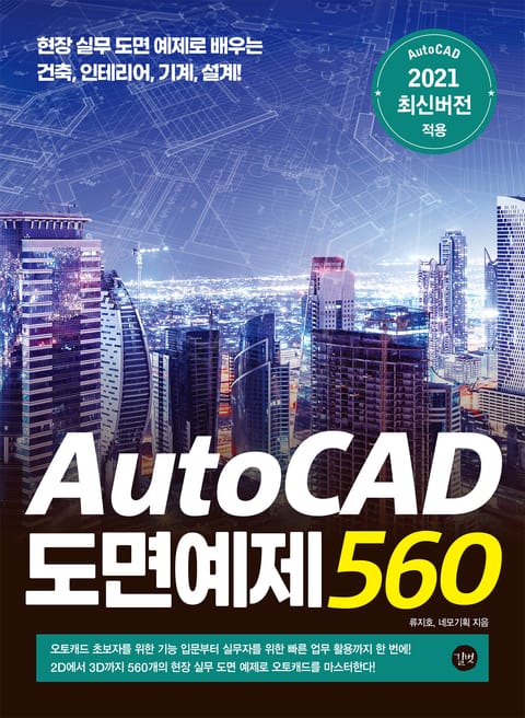 AutoCAD는 건축, 인테리어, 기계, 설계 등 다양한 분야에서 사용되며 2D 도면 작업뿐만 아니라 형상을 입체적으로 구현할 수 있는 3D 작업도 가능합니다. 《AutoCAD 도면예제 560》은 2016년에 출간되었던 《AutoCAD 도면예제 545》의 개정판으로, 최신 버전인 AutoCAD 2021 버전을 적용하고 실무 도면 예제를 더욱 보강하여 출간했습니다.