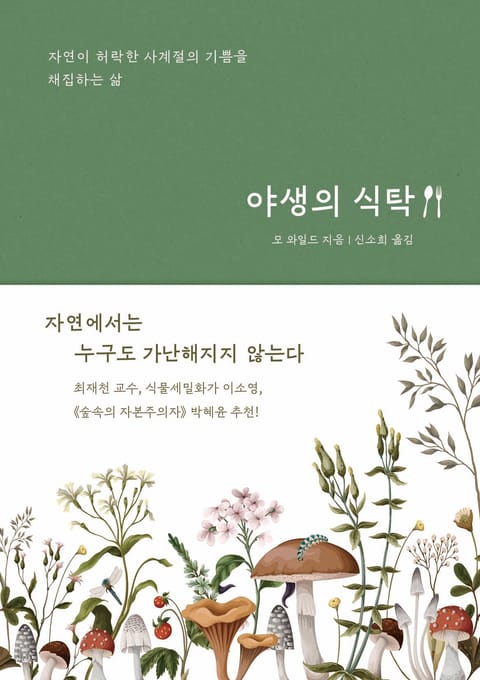 기후 위기와 자연 파괴를 염려하면서도 기꺼이 무한 욕망의 소비 지옥으로 뛰어드는 사람들을 보며, 모 와일드는 한 가지 질문을 떠올린다. ‘정말로 지구에 식량 위기가 닥친다면 우리는 채집‧수렵만으로 생존할 수 있을까?’ 이 책은 그 답을 얻기 위해 직접 채취와 야생식만으로 살아보겠다고 나선 저자의 도전기다. 자연을 사랑하는 채취인이자 약초학자인 모 와일드는 일 년 동안 마트에 가는 대신 숲에서 나뭇잎과 버섯을 따고 바다에서 해초를 뜯는다. 도토리 가루로 팬케이크를 굽고 난생처음 고등어 낚시에 도전한다. 매 끼니가 고군분투다. 그런데 이렇게 계절마다 자연이 내주는 것들에 의지해 살아 보니, 배만 부른 게 아니라 마음도 넉넉해진다. 오늘 저녁 식탁에 오를 눈앞의 자연에 집중하는 순간, 복잡한 생각은 전부 사라지고 단순한 즐거움이 솟는다. 미슐랭 스타 레스토랑에서 먹는 값비싼 요리가 하나도 안 부럽다.