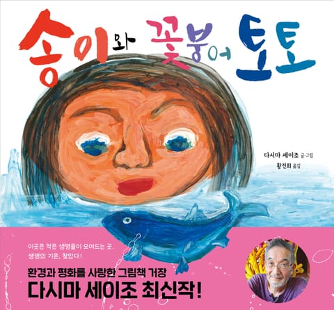 이 그림책 《송이와 꽃붕어 토토》는 소녀와 물에 사는 작은 물고기 이야기입니다. 이야기의 주인공은 오히려 물고기 쪽이고, 토토가 물속에서 송이를 보고 있는 시점입니다.