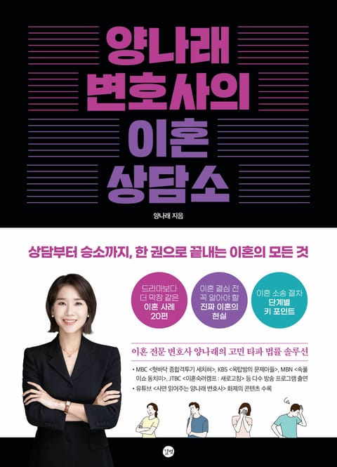 MBC 〈혓바닥 종합격투기 세치혀〉, KBS 〈옥탑방의 문제아들〉, MBN 〈속풀이쇼 동치미〉, JTBC 〈이혼숙려캠프 : 새로고침〉, SBS 라디오 〈박세미 수다가 체질 - 세미네 로펌〉 등의 다수 방송 프로그램에 출연하며, 재치 있는 입담으로 쉽고 재미있게 법률 솔루션을 제공해주는 방송인 겸 가사법 전문변호사 ‘양나래’. 이번에는 이 책의 작가로서, 높아진 이혼률처럼 부부와의 갈등으로 고통스러운 나날을 보내고 있는 많은 분들을 위해 실제 이혼 사례와 유용한 도움을 주는 법률 정보를 아낌없이 담았다.