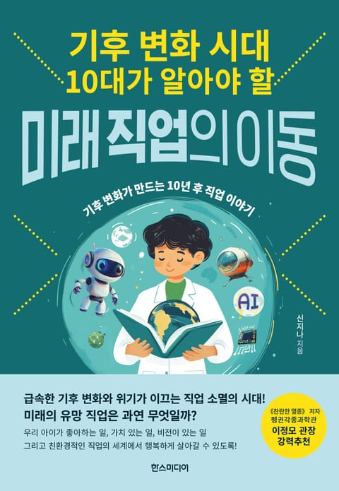 해가 지날수록 심화하는 이상 기후 현상에 이런 궁금증이 든다. 온실가스로 인한 온난화, 폭풍, 폭우, 빠르게 녹는 빙하… 이러한 기후 변화가 우리 미래의 삶에서 사라질 수 있을까? 빠르게 변하는 미래에 안정적인 직업은 무엇일까? 《기후 변화 시대, 10대가 알아야 할 미래 직업의 이동》은 기후 변화의 역사와 현실을 꼼꼼히 짚으며 자주 들어 익숙해진 기후 변화 현상의 발자취를 다시 한번 더듬는다. 또 기후 위기로 인해 변화하게 될 미래 직업 세계에 주목하여 미래 직업을 선택할 때 고려해야 하는 중요 요인을 인공 지능(AI), 수명(Age), 기후테크(Climate tech)라는 세 가지 키워드를 중심으로 정리한다. 인공 지능이 인력을 대체하고 인간의 평균 수명이 늘어나며 기후 관련 기술이 부상하고 있는 미래에 어떤 직업을 가져야 할까? 어떻게 미래를 준비해야 지구를 지키고 행복한 환경에서 살아갈 수 있을까? 이 책은 미래 직업을 꿈꾸는 10대를 위해 기후 변화로 부상할 5가지 기후테크 분야(클린테크, 카본테크, 에코테크, 푸드테크, 지오테크)를 소개하고 있다. 여기에 김혜륜 변호사의 법 이야기를 더해 자세한 정보를 알고자 하는 이들에게 조언을 제공하고 있다. 우리는 지금 인공 지능과 첨단 기술의 발전, 그리고 기후 변화가 맞물린 거대한 전환점에 서 있다. 소멸하고 탄생하는 직업들 속에서 변화가 만들어낼 새로운 기회를 잡아야 한다. 이 책을 통해 기후 위기 시대 청소년들이 변화하는 세계를 마주하고 친환경적인 미래를 준비할 수 있기를 바란다.