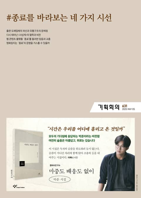 출판 불황이 계속되는 가운데 웹 콘텐츠 플랫폼의 서비스 종료, 도서 도매업체의 파산 등 ‘종료’ 소식이 계속해서 들려온다. 플랫폼이나 도매업체의 일방적인 ‘종료’부터 훌륭한 문화콘텐츠의 아쉬운 ‘종료’와 그 뒤에 이어지는 새로운 시작까지, ‘종료’를 둘러싸고 펼쳐지는 출판인들의 다양한 이야기를 들어본다.