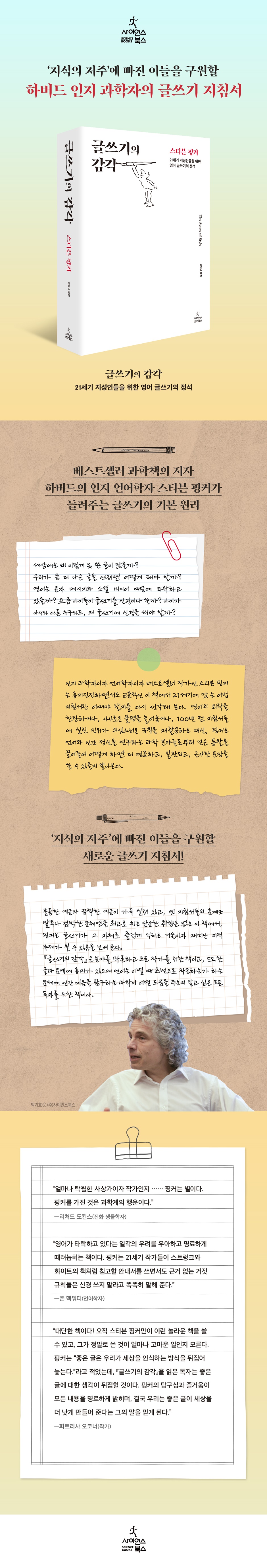 이번에 ㈜사이언스북스에서 출간된 『글쓰기의 감각: 21세기 지성인들을 위한 영어 글쓰기의 정석(The Sense of Style: The Thinking Person’s Guide to Writing in the 21st Century)』은 인지 과학자이자 언어학자, 그리고 베스트셀러 과학 저술가로 유명한 하버드 대학교의 스티븐 핑커(Steven Pinker) 교수가 펴낸 영어 글쓰기 지침서이다. 핑커는 흥미진진하면서도 교훈적인 이 책에서 21세기에 맞는 어법 지침서란 어때야 할지를 다시 생각해 본다. 언어의 퇴락을 한탄하거나, 사사로운 불평을 늘어놓거나, 100년 전 지침서들에 실린 진위가 의심스러운 규칙을 재활용하는 대신, 핑커는 언어와 인간 정신을 연구하는 과학 분야들로부터 얻은 통찰을 끌어들여 어떻게 하면 더 명료하고, 일관되고, 근사한 문장을 쓸 수 있을지 알아본다.