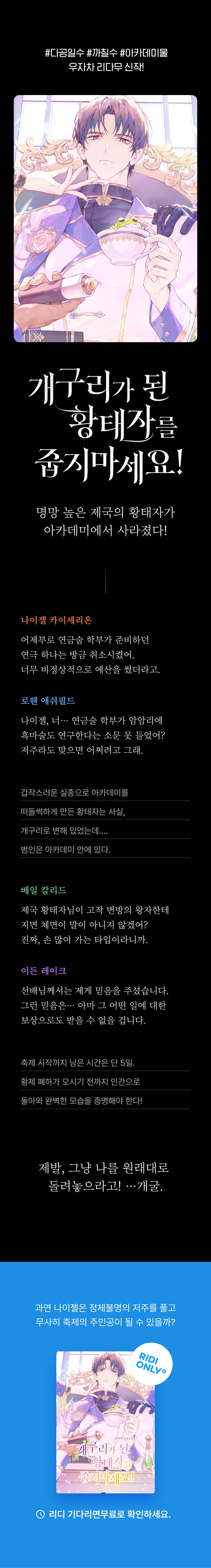 *수 : 나이젤 카이세리온 : 고결한 카이세리온 제국의 1황자이자, 황태자. 자신과 남 모두에게 공평하게 원칙주의를 적용하는 완벽주의자. 아카데미에서 가장 큰 축제 마르디니아를 준비하는 도중, 돌연 개구리가 되어버린다.