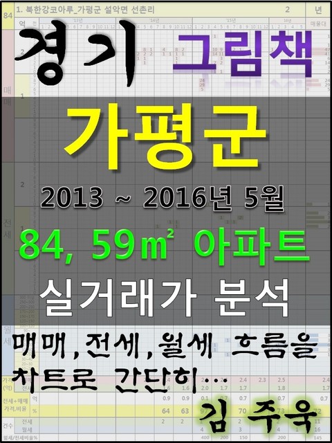 안녕하세요. 김주욱 입니다. 이 책은 그림책입니다. 아파트 가격에 대하여 누구나 쉽게 이해할 수 있도록, 그림으로 나타냈습니다. 복잡한 문장이 아닌 해당 아파트에 대한 가격 흐름을 그림으로 나타내어 누구나 쉽게 살펴 볼 수있고, 본인이 직접 판단할 수 있도록 만들었습니다. 해당 아파트에 대한 분석 의견은 수록하지 않았습니다. 타인의 재산에 대하여 평가를 한다는 것 자체가 큰 부담이 되어, 투자의견은 없다는 점 양해 바랍니다. 하지만, 이 책의 차트를 계속 보게되면, 어디를 공략해야 할지 쉽게 알 수 있을 것입니다. 아파트는 주거의 대상일 뿐 아니라 투자의 대상이기도 합니다. 여러분이 관심 있는 아파트의 가격 흐름을 살펴 보시고, 어떤 방향으로 접근해야할지 한번 생각해 보시기 바랍니다. 흔히 가격은 모든 것이 집결 된 종합 예술이라고 합니다. 요즘 아파트의 선정기준은 입지, 교육, 교통, 문화, 쇼핑 등 모든 것이 반영 되어 있습니다. 단 한권의 책으로 그 모든 것을 기술하기에는 내용이 너무 많고, 사실 그렇게 해봤자 정리가 잘되지 않습니다. 이에, 가격의 흐름을 통해서 어떤 방향으로 움직이는지, 앞으로 어떤 방향으로 전개될 것인지 생각해 보시기 바랍니다. 어려운 용어와 긴 문장으로 현상을 자세히 설명하는 것도 좋지만, 저는 단지 가격 흐름을 시각적으로 보여드리겠습니다. 아주 간단한 차트 한 장으로 특정 아파트의 분위기를 느껴 보시기 바랍니다. 이 한권의 책으로 많은 정보를 얻으시고, 각 구별로 계속 출간을 할 예정으로 관심있게 지켜봐 주시기 바랍니다. 1. 북한강코아루_가평군 설악면 선촌리 2. 우림필유 1단지_가평군 가평읍 대곡리 3. 청평삼성쉐르빌_가평군 청평면 청평리 4. 에이원파란채_가평군 가평읍 읍내리 5. 경남아너스빌_가평군 청평면 청평리 6. 청평세양청마루_가평군 청평면 청평리 7. 썬힐_가평군 가평읍 대곡리 8. 효신(101동)_가평군 가평읍 읍내리 9. 효신(102동)_가평군 가평읍 읍내리 10. 삼성홈타운_가평군 가평읍 대곡리 11. 청구_가평군 청평면 청평리 12. 로얄_가평군 청평면 청평리 13. 세대넥스빌_가평군 가평읍 달전리 14. 제이정동101동_가평군 가평읍 읍내리 15. J정동_가평군 가평읍 읍내리 16. (799-5)_가평군 가평읍 읍내리 17. 청일덱스빌(1동)_가평군 청평면 청평리 18. 준수아파트A동_가평군 가평읍 읍내리 19. 형진타워_가평군 가평읍 읍내리 20. 중앙_가평군 가평읍 읍내리 21. 태광_가평군 가평읍 대곡리 22. 신초_가평군 가평읍 달전리 23. 송안_가평군 가평읍 읍내리 24. 준수아파트B동_가평군 가평읍 읍내리 25. 유성_가평군 가평읍 달전리 26. 임성_가평군 하면 현리