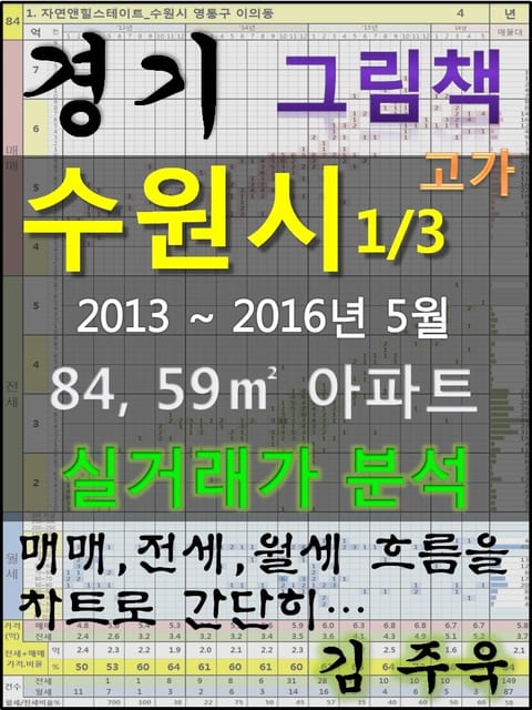 안녕하세요. 김주욱 입니다. 이 책은 그림책입니다. 아파트 가격에 대하여 누구나 쉽게 이해할 수 있도록, 그림으로 나타냈습니다. 복잡한 문장이 아닌 해당 아파트에 대한 가격 흐름을 그림으로 나타내어 누구나 쉽게 살펴 볼 수있고, 본인이 직접 판단할 수 있도록 만들었습니다. 해당 아파트에 대한 분석 의견은 수록하지 않았습니다. 타인의 재산에 대하여 평가를 한다는 것 자체가 큰 부담이 되어, 투자의견은 없다는 점 양해 바랍니다. 하지만, 이 책의 차트를 계속 보게되면, 어디를 공략해야 할지 쉽게 알 수 있을 것입니다. 아파트는 주거의 대상일 뿐 아니라 투자의 대상이기도 합니다. 여러분이 관심 있는 아파트의 가격 흐름을 살펴 보시고, 어떤 방향으로 접근해야할지 한번 생각해 보시기 바랍니다. 흔히 가격은 모든 것이 집결 된 종합 예술이라고 합니다. 요즘 아파트의 선정기준은 입지, 교육, 교통, 문화, 쇼핑 등 모든 것이 반영 되어 있습니다. 단 한권의 책으로 그 모든 것을 기술하기에는 내용이 너무 많고, 사실 그렇게 해봤자 정리가 잘되지 않습니다. 이에, 가격의 흐름을 통해서 어떤 방향으로 움직이는지, 앞으로 어떤 방향으로 전개될 것인지 생각해 보시기 바랍니다. 어려운 용어와 긴 문장으로 현상을 자세히 설명하는 것도 좋지만, 저는 단지 가격 흐름을 시각적으로 보여드리겠습니다. 아주 간단한 차트 한 장으로 특정 아파트의 분위기를 느껴 보시기 바랍니다. 이 한권의 책으로 많은 정보를 얻으시고, 각 구별로 계속 출간을 할 예정으로 관심있게 지켜봐 주시기 바랍니다. 1. 자연앤힐스테이트_수원시 영통구 이의동 2. 광교호수마을 참누리레이크_수원시 영통구 하동 3. 광교2차e편한세상_수원시 영통구 이의동 4. 광교호반베르디움_수원시 영통구 원천동 5. 광교호반베르디움_수원시 영통구 이의동 6. 광교한양수자인_수원시 영통구 이의동 7. 광교LAKEPARK한양수자인_수원시 영통구 하동 8. 매탄위브하늘채_수원시 영통구 매탄동 9. 래미안 영통마크원 2단지_수원시 영통구 신동 10. 광교웰빙타운LH해모로_수원시 영통구 이의동 11. 래미안 영통마크원 1단지_수원시 영통구 신동 12. 수원 SK SKY VIEW_수원시 장안구 정자동 13. 수원화서역 동문굿모닝힐_수원시 팔달구 화서동 14. e-편한세상_수원시 영통구 매탄동 15. 래미안노블클래스1단지_수원시 팔달구 인계동 16. 광교대광로제비앙_수원시 영통구 이의동 17. 수원장안힐스테이트_수원시 장안구 이목동 18. 래미안노블클래스2단지_수원시 팔달구 인계동 19. 권선자이e편한세상_수원시 권선구 권선동 20. 한양수자인_수원시 영통구 망포동 21. 신나무실건영_수원시 영통구 영통동 22. 수원아이파크시티5단지_수원시 권선구 권선동 23. 천천푸르지오_수원시 장안구 천천동 24. 벽산(957-6)_수원시 영통구 영통동 25. 매탄주공5_수원시 영통구 매탄동 26. 삼익_수원시 영통구 영통동 27. 수원아이파크시티4단지_수원시 권선구 권선동 28. 수원아이파크시티2단지_수원시 권선구 권선동 29. 월드메르디앙_수원시 팔달구 우만동 30. 장안STX칸1단지_수원시 장안구 이목동 31. 수원아이파크시티3단지_수원시 권선구 권선동 32. 수원아이파크시티1단지_수원시 권선구 권선동 33. 수원아이파크시티6단지_수원시 권선구 권선동 34. 신나무실극동_수원시 영통구 영통동 35. 신나무실풍림_수원시 영통구 영통동 36. 광교캠퍼스타운참누리_수원시 영통구 이의동 37. 정자KT e-편한세상_수원시 장안구 정자동 38. 현대힐스테이트_수원시 영통구 매탄동 39. 비단마을베스트타운_수원시 장안구 천천동 40. 권선SKVIEW_수원시 권선구 권선동 41. 태영_수원시 영통구 영통동 42. 장안STX칸2단지_수원시 장안구 이목동 43. 한일타운쌍용_수원시 장안구 조원동 44. 화서위브하늘채_수원시 팔달구 화서동 45. 청솔마을주공_수원시 장안구 정자동 46. 풍림_수원시 영통구 영통동 47. 신나무실신명_수원시 영통구 영통동 48. 수원인계푸르지오_수원시 팔달구 인계동 49. 현대_수원시 팔달구 우만동 50. 건영1차_수원시 영통구 영통동 51. 화서블루밍푸른숲_수원시 팔달구 화서동 52. 한일타운대림_수원시 장안구 조원동 53. 주공그린빌3_수원시 영통구 매탄동 54. 한일타운우성_수원시 장안구 조원동 55. 대월마을대림진흥_수원시 장안구 정자동 56. 화서3단지주공_수원시 팔달구 화서동 57. 삼성_수원시 영통구 영통동 58. 벽산(1053-2)_수원시 영통구 영통동 59. 신나무실동보_수원시 영통구 영통동 60. 그대가프리미어_수원시 영통구 망포동 61. 건영1_수원시 영통구 영통동 62. 원천2주공_수원시 영통구 원천동 63. 주공그린빌1_수원시 영통구 매탄동 64. 백설마을주공_수원시 장안구 정자동 65. 주공그린빌2_수원시 영통구 매탄동 66. 동수원엘지빌리지2차_수원시 영통구 망포동 67. 동수원LG빌리지3_수원시 영통구 망포동 68. 꽃뫼버들마을금강_수원시 팔달구 화서동 69. 서수원 레이크 푸르지오 1단지_수원시 권선구 입북동 70. 칠보마을6단지_수원시 권선구 금곡동 71. 가온마을3단지_수원시 권선구 금곡동 72. 망포현대1아이파크_수원시 영통구 망포동 73. 화서한신휴플러스_수원시 팔달구 화서동 74. 꽃뫼마을코오롱_수원시 팔달구 화서동 75.