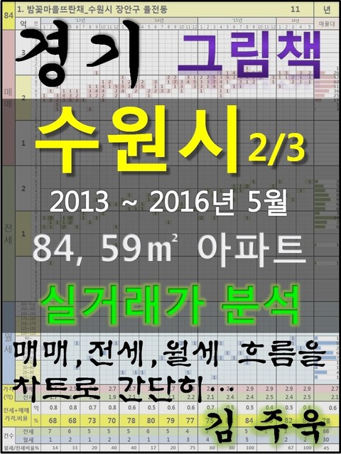 안녕하세요. 김주욱 입니다. 이 책은 그림책입니다. 아파트 가격에 대하여 누구나 쉽게 이해할 수 있도록, 그림으로 나타냈습니다. 복잡한 문장이 아닌 해당 아파트에 대한 가격 흐름을 그림으로 나타내어 누구나 쉽게 살펴 볼 수있고, 본인이 직접 판단할 수 있도록 만들었습니다. 해당 아파트에 대한 분석 의견은 수록하지 않았습니다. 타인의 재산에 대하여 평가를 한다는 것 자체가 큰 부담이 되어, 투자의견은 없다는 점 양해 바랍니다. 하지만, 이 책의 차트를 계속 보게되면, 어디를 공략해야 할지 쉽게 알 수 있을 것입니다. 아파트는 주거의 대상일 뿐 아니라 투자의 대상이기도 합니다. 여러분이 관심 있는 아파트의 가격 흐름을 살펴 보시고, 어떤 방향으로 접근해야할지 한번 생각해 보시기 바랍니다. 흔히 가격은 모든 것이 집결 된 종합 예술이라고 합니다. 요즘 아파트의 선정기준은 입지, 교육, 교통, 문화, 쇼핑 등 모든 것이 반영 되어 있습니다. 단 한권의 책으로 그 모든 것을 기술하기에는 내용이 너무 많고, 사실 그렇게 해봤자 정리가 잘되지 않습니다. 이에, 가격의 흐름을 통해서 어떤 방향으로 움직이는지, 앞으로 어떤 방향으로 전개될 것인지 생각해 보시기 바랍니다. 어려운 용어와 긴 문장으로 현상을 자세히 설명하는 것도 좋지만, 저는 단지 가격 흐름을 시각적으로 보여드리겠습니다. 아주 간단한 차트 한 장으로 특정 아파트의 분위기를 느껴 보시기 바랍니다. 이 한권의 책으로 많은 정보를 얻으시고, 각 구별로 계속 출간을 할 예정으로 관심있게 지켜봐 주시기 바랍니다. 1. 밤꽃마을뜨란채_수원시 장안구 율전동 2. 삼성2_수원시 장안구 율전동 3. 현대_수원시 영통구 매탄동 4. 엘지빌리지3_수원시 권선구 금곡동 5. 서희스타힐스3단지_수원시 장안구 율전동 6. 신우_수원시 권선구 권선동 7. 삼성1_수원시 장안구 율전동 8. 삼호벽산_수원시 권선구 권선동 9. 동도센트리움_수원시 팔달구 우만동 10. 신반포수원(한신)_수원시 팔달구 인계동 11. 동양파라곤_수원시 장안구 송죽동 12. 황골마을주공1_수원시 영통구 영통동 13. 청솔마을한라_수원시 장안구 정자동 14. 엘지빌리지2_수원시 권선구 금곡동 15. 꽃뫼버들마을진흥_수원시 팔달구 화서동 16. 삼성1_수원시 영통구 매탄동 17. 엘지빌리지4_수원시 권선구 금곡동 18. 임광_수원시 영통구 매탄동 19. 선경3_수원시 팔달구 인계동 20. 성원_수원시 권선구 구운동 21. 성균관대역서희스타힐스아파트1단지_수원시 장안구 율전동 22. 마젤란21_수원시 영통구 망포동 23. 그대가포레스트_수원시 장안구 조원동 24. 서수원울트라참누리파크A단지_수원시 권선구 서둔동 25. 신성미소지움_수원시 팔달구 우만동 26. 인계희성연인_수원시 팔달구 인계동 27. 극동의푸른별_수원시 영통구 망포동 28. 서희스타힐스2단지_수원시 장안구 율전동 29. 벽적골휴먼시아9단지_수원시 영통구 영통동 30. 벽적골한신_수원시 영통구 영통동 31. 벽적골두산_수원시 영통구 영통동 32. 벽적골우성_수원시 영통구 영통동 33. 신일_수원시 장안구 율전동 34. 서수원엠코타운르본느_수원시 권선구 구운동 35. 한라비발디1단지_수원시 권선구 당수동 36. 벽적골롯데_수원시 영통구 영통동 37. 삼성2_수원시 영통구 매탄동 38. 우만주공2단지_수원시 팔달구 우만동 39. 오목천동 대우 푸르지오 1단지_수원시 권선구 오목천동 40. 주공그린빌5_수원시 영통구 매탄동 41. 능실마을19단지_수원시 권선구 호매실동 42. 선경1_수원시 팔달구 인계동 43. 마젤란21(1101동)_수원시 영통구 망포동 44. 송죽동희성연인_수원시 장안구 송죽동 45. 삼천리1차_수원시 권선구 권선동 46. 권선어울림_수원시 권선구 세류동 47. 두견(우방한솔)_수원시 장안구 정자동 48. 늘푸른벽산_수원시 영통구 망포동 49. 청명마을(주공)_수원시 영통구 영통동 50. 호매실GS_수원시 권선구 호매실동 51. 화서4단지주공_수원시 팔달구 화서동 52. 삼호진덕_수원시 장안구 천천동 53. 두견마을현대벽산_수원시 장안구 정자동 54. 백설마을코오롱_수원시 장안구 정자동 55. 신명_수원시 장안구 천천동 56. 권선3지구주공3_수원시 권선구 권선동 57. 우림필유_수원시 권선구 고색동 58. 한라비발디2단지_수원시 권선구 당수동 59. 상록3단지_수원시 권선구 권선동 60. 오목천동 대우 푸르지오 2단지_수원시 권선구 오목천동 61. 성원쌍떼빌_수원시 팔달구 화서동 62. 벽산블루밍_수원시 장안구 율전동 63. 쌍용스윗닷홈2차_수원시 영통구 망포동 64. 동남_수원시 권선구 평동 65. 쌍용스윗닷홈1단지_수원시 권선구 당수동 66. 망포벽산이빌리지_수원시 영통구 망포동 67. 선경_수원시 팔달구 우만동 68. 극동_수원시 영통구 매탄동 69. 삼성_수원시 팔달구 우만동 70. 성균관대역 서희스타힐스 2단지_수원시 장안구 율전동 71. 정자2차희성연인_수원시 장안구 정자동 72. 성원_수원시 장안구 연무동 73. 황골마을(쌍용)_수원시 영통구 영통동 74. 백설마을진로삼환_수원시 장안구 정자동 75. 신나무실신성_수원시 영통구 영통동 76. 신나무실신안_수원시 영통구 영통동 77. 권선신일유토빌_수원시 권선구 곡반정동 78. 한양_수원시 권선구 권선동 79. 신미주_수원시 장안구 연무동 80. 백설