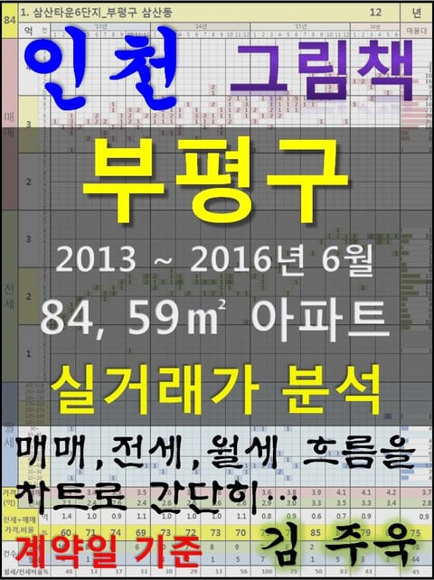 안녕하세요. 김주욱 입니다. 이 책은 그림책입니다. 아파트 가격에 대하여 누구나 쉽게 이해할 수 있도록, 그림으로 나타냈습니다. 복잡한 문장이 아닌 해당 아파트에 대한 가격 흐름을 그림으로 나타내어 누구나 쉽게 살펴 볼 수있고, 본인이 직접 판단할 수 있도록 만들었습니다. 이 책을 보고 좋은 투자를 하시는 것도 좋지만, 나쁜 투자를 하지 않는 것이 더 큰 성과라고 생각합니다. 그릇된 투자로 자금이 고갈되고, 심적 고통을 받는 것 보다 간단히 확인함으로써, 그것을 피할 수 있다는 것이 가장 중요하다고 생각합니다. 해당 아파트에 대한 분석 의견은 수록하지 않았습니다. 타인의 재산에 대하여 평가를 한다는 것 자체가 큰 부담이 되어, 투자의견은 없다는 점 양해 바랍니다. 하지만, 이 책의 차트를 계속 보게되면, 어디를 공략해야 할지 쉽게 알 수 있을 것입니다. 아파트는 주거의 대상일 뿐 아니라 투자의 대상이기도 합니다. 여러분이 관심 있는 아파트의 가격 흐름을 살펴 보시고, 어떤 방향으로 접근해야할지 한번 생각해 보시기 바랍니다. 흔히 가격은 모든 것이 집결 된 종합 예술이라고 합니다. 요즘 아파트의 선정기준은 입지, 교육, 교통, 문화, 쇼핑 등 모든 것이 반영 되어 있습니다. 단 한권의 책으로 그 모든 것을 기술하기에는 내용이 너무 많고, 사실 그렇게 해봤자 정리가 잘되지 않습니다. 이에, 가격의 흐름을 통해서 어떤 방향으로 움직이는지, 앞으로 어떤 방향으로 전개될 것인지 생각해 보시기 바랍니다. 어려운 용어와 긴 문장으로 현상을 자세히 설명하는 것도 좋지만, 저는 단지 가격 흐름을 시각적으로 보여드리겠습니다. 아주 간단한 차트 한 장으로 특정 아파트의 분위기를 느껴 보시기 바랍니다. 여러분이 관심있는 곳 뿐만아닌 유사한 아파트도 참조하시어 현명한 선택을 하시길 바랍니다. ※주의. 본 자료는 실거래가 사이트에서 제공하고 있는 계약일 기준 자료로 통계자료 활용시에는 수치가 왜곡될 수 있으니 참고자료로만 활용하시기 바라며, 외부 공개시에는 반드시 신고일 기준으로 집계되는 공식통계를 이용하여 주시기 바랍니다. 1. 삼산타운6단지_부평구 삼산동 2. 삼산타운7단지_부평구 삼산동 3. 부개역푸르지오_부평구 부개동 4. 래미안부평_부평구 부평동 5. 부평산곡푸르지오_부평구 산곡동 6. 삼산타운2단지_부평구 삼산동 7. 금호이수마운트밸리_부평구 산곡동 8. 서해그랑블_부평구 삼산동 9. 부개주공6_부평구 부개동 10. 부평LH 2단지_부평구 부평동 11. 부평삼산엠코타운_부평구 삼산동 12. 동아(2차)_부평구 부평동 13. 금호1_부평구 청천동 14. 한화2단지_부평구 산곡동 15. 임광그대가_부평구 삼산동 16. 금호2_부평구 청천동 17. 부평자이_부평구 구산동 18. 삼산주공미래타운5차_부평구 삼산동 19. 동아(1차)_부평구 부평동 20. 브라운스톤백운_부평구 십정동 21. 삼산타운주공1단지_부평구 삼산동 22. 삼산벽산블루밍_부평구 삼산동 23. 두산위브_부평구 부평동 24. 대우_부평구 부평동 25. 대우_부평구 청천동 26. 한화1단지_부평구 산곡동 27. 대우_부평구 갈산동 28. 아주_부평구 갈산동 29. 창보_부평구 부평동 30. 현대(124-1)_부평구 산곡동 31. 신명스카이뷰_부평구 산곡동 32. 동암신동아_부평구 십정동 33. 한신휴_부평구 산곡동 34. 경남4차_부평구 산곡동 35. 경남3차_부평구 산곡동 36. 풍림아파트(101~110동)_부평구 일신동 37. 부평금호어울림_부평구 십정동 38. 미가로_부평구 청천동 39. 우성3차(294-35)_부평구 산곡동 40. 삼성홈타운_부평구 갈산동 41. 십정뜨란채1단지_부평구 십정동 42. 주공5_부평구 부개동 43. 우성1차2차(294-35)_부평구 산곡동 44. 하나_부평구 갈산동 45. 경남2차_부평구 산곡동 46. 대림1차_부평구 부평동 47. 신성미소지움아파트(101~106동)_부평구 부평동 48. 동남_부평구 갈산동 49. 팬더_부평구 갈산동 50. 현대2차_부평구 산곡동 51. 대동(494-1)_부평구 부개동 52. 경남1차_부평구 산곡동 53. 한국_부평구 갈산동 54. 쌍용_부평구 청천동 55. 현대3차_부평구 산곡동 56. 한국1_부평구 갈산동 57. 한국1_부평구 부평동 58. 리노빌_부평구 부개동 59. 부개주공1_부평구 부개동 60. 삼산주공미래타운4차_부평구 삼산동 61. 현대1차_부평구 산곡동 62. 태화프리상뜨_부평구 산곡동 63. 대성유니드_부평구 갈산동 64. 동아_부평구 갈산동 65. 경남5차_부평구 산곡동 66. 대동2_부평구 갈산동 67. 현대_부평구 부개동 68. 부평라일실크빌아파트_부평구 부평동 69. 부개주공3_부평구 부개동 70. 삼산주공미래타운3차_부평구 삼산동 71. 부개주공7단지_부평구 부개동 72. 삼산주공미래타운1차_부평구 삼산동 73. 광명_부평구 청천동 74. 현대(179-92)_부평구 산곡동 75. 우성4차_부평구 산곡동 76. 현대(179-69)_부평구 산곡동 77. 한양(185-17)_부평구 산곡동 78. 삼보_부평구 삼산동 79. 현대_부평구 삼산동 80. 대주파크빌_부평구 십정동 81. 한양(155-1)_부평구 산곡동 82. 우성5차_부평구 산곡동 83. 백영_부평구 부개동 84. 목동휘버스_부평구 십정동 85. 우림필유(192-0)_부평구 청천동 86. 욱일_부평구 부평동 87. 뉴서울(255-1)_부평구 산곡동 88. 한국_부평구 부개동 89. 뉴서울(264-1)_부평구 산곡동 90. 동보_부평구 십정동 91. 대경이즈뷰_부평구