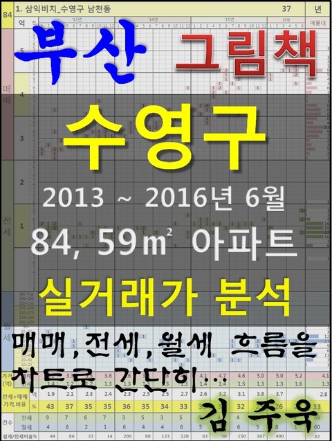 안녕하세요. 김주욱 입니다. 이 책은 그림책입니다. 아파트 가격에 대하여 누구나 쉽게 이해할 수 있도록, 그림으로 나타냈습니다. 복잡한 문장이 아닌 해당 아파트에 대한 가격 흐름을 그림으로 나타내어 누구나 쉽게 살펴 볼 수있고, 본인이 직접 판단할 수 있도록 만들었습니다. 이 책을 보고 좋은 투자를 하시는 것도 좋지만, 나쁜 투자를 하지 않는 것이 더 큰 성과라고 생각합니다. 그릇된 투자로 자금이 고갈되고, 심적 고통을 받는 것 보다 간단히 확인함으로써, 그것을 피할 수 있다는 것이 가장 중요하다고 생각합니다. 해당 아파트에 대한 분석 의견은 수록하지 않았습니다. 타인의 재산에 대하여 평가를 한다는 것 자체가 큰 부담이 되어, 투자의견은 없다는 점 양해 바랍니다. 하지만, 이 책의 차트를 계속 보게되면, 어디를 공략해야 할지 쉽게 알 수 있을 것입니다. 아파트는 주거의 대상일 뿐 아니라 투자의 대상이기도 합니다. 여러분이 관심 있는 아파트의 가격 흐름을 살펴 보시고, 어떤 방향으로 접근해야할지 한번 생각해 보시기 바랍니다. 흔히 가격은 모든 것이 집결 된 종합 예술이라고 합니다. 요즘 아파트의 선정기준은 입지, 교육, 교통, 문화, 쇼핑 등 모든 것이 반영 되어 있습니다. 단 한권의 책으로 그 모든 것을 기술하기에는 내용이 너무 많고, 사실 그렇게 해봤자 정리가 잘되지 않습니다. 이에, 가격의 흐름을 통해서 어떤 방향으로 움직이는지, 앞으로 어떤 방향으로 전개될 것인지 생각해 보시기 바랍니다. 어려운 용어와 긴 문장으로 현상을 자세히 설명하는 것도 좋지만, 저는 단지 가격 흐름을 시각적으로 보여드리겠습니다. 아주 간단한 차트 한 장으로 특정 아파트의 분위기를 느껴 보시기 바랍니다. 여러분이 관심있는 곳 뿐만아닌 유사한 아파트도 참조하시어 현명한 선택을 하시길 바랍니다. ※주의. 본 자료는 실거래가 사이트에서 제공하고 있는 계약일 기준 자료로 통계자료 활용시에는 수치가 왜곡될 수 있으니 참고자료로만 활용하시기 바라며, 외부 공개시에는 반드시 신고일 기준으로 집계되는 공식통계를 이용하여 주시기 바랍니다. 1. 삼익비치_수영구 남천동 2. 코오롱하늘채골든비치_수영구 남천동 3. 부산더샵센텀포레_수영구 민락동 4. 쌍용예가디오션_수영구 광안동 5. 뉴비치_수영구 남천동 6. 수영만아이파크_수영구 민락동 7. 협진태양_수영구 남천동 8. 수영강동원로얄듀크_수영구 수영동 9. 현대_수영구 수영동 10. 수영협성르네상스타운_수영구 수영동 11. 롯데캐슬자이언트_수영구 민락동 12. 삼익타워_수영구 남천동 13. 센텀비치푸르지오_수영구 민락동 14. 협성엠파이어(101,102동)_수영구 광안동 15. 협성엠파이어(103,105동)_수영구 광안동 16. 이편한세상3차_수영구 망미동 17. 대우푸르지오_수영구 민락동 18. 더샵파크리치_수영구 망미동 19. 우성보라_수영구 남천동 20. 이편한세상1차_수영구 망미동 21. 대우포르투나_수영구 남천동 22. 광안동에스케이뷰_수영구 광안동 23. 이편한세상2차_수영구 망미동 24. 동원보라_수영구 남천동 25. 반도보라맨션_수영구 남천동 26. 삼도그린맨션_수영구 광안동 27. 비치그린_수영구 광안동 28. 화목타운_수영구 남천동 29. 광안하이캐슬_수영구 광안동 30. 진주_수영구 남천동 31. 광안동일스위트_수영구 광안동 32. 오양평구_수영구 광안동 33. 봉황(3-15)_수영구 남천동 34. 광안 협성엠파이어Ⅱ_수영구 광안동 35. 협성엠파이어106동_수영구 광안동 36. 신우피렌체_수영구 광안동 37. 광안메르빌_수영구 광안동 38. 광안파크2_수영구 광안동 39. 정원타워Ⅰ_수영구 광안동 40. 광원_수영구 광안동 41. 진로비치(101~103동)_수영구 민락동 42. 백산_수영구 남천동 43. 동트레_수영구 광안동 44. 광안타워_수영구 광안동 45. 정원골드_수영구 광안동 46. 정원스카이_수영구 광안동 47. 진로비치(201,202동)_수영구 민락동 48. 고은파크뷰_수영구 광안동 49. 태평양하이츠_수영구 광안동 50. 글로벌하일타운_수영구 광안동 51. 협성센트로2차_수영구 광안동 52. 한성기린_수영구 망미동 53. 송파지오스V_수영구 광안동 54. 극동맨션_수영구 광안동 55. 남천파크_수영구 남천동 56. 진흥목화_수영구 남천동 57. 남강하이츠_수영구 광안동 58. 진우_수영구 남천동 59. 카라디움_수영구 민락동 60. 광안하이빌_수영구 광안동 61. 광안파크1_수영구 광안동 62. 동산오차드힐_수영구 광안동 63. 광남2차_수영구 남천동 64. 글로벌하일타운2차_수영구 광안동 65. 남천시티빌_수영구 남천동 66. 흑석파크_수영구 광안동 67. 삼성_수영구 망미동 68. 현대한누리_수영구 망미동 69. 금보빌라_수영구 광안동 70. 삼흥파크타운_수영구 광안동 71. 봉황파크_수영구 남천동 72. 동원맨션(776-21)_수영구 광안동 73. 광안센템빌_수영구 광안동 74. 세종타워_수영구 광안동 75. 금수하이빌_수영구 광안동 76. 상아_수영구 광안동 77. 송현다미랑_수영구 민락동 78. 여명비치_수영구 광안동 79. 남천마르빌_수영구 남천동 80. 대곡타워_수영구 광안동 81. 광일센텀스카이뷰_수영구 광안동 82. 이화_수영구 광안동 83. 흥산빌리지_수영구 광안동 84. 광안명진웰리치_수영구 광안동 85. 솔내음파비르_수영구 광안동 86. 부덕그린_수영구 