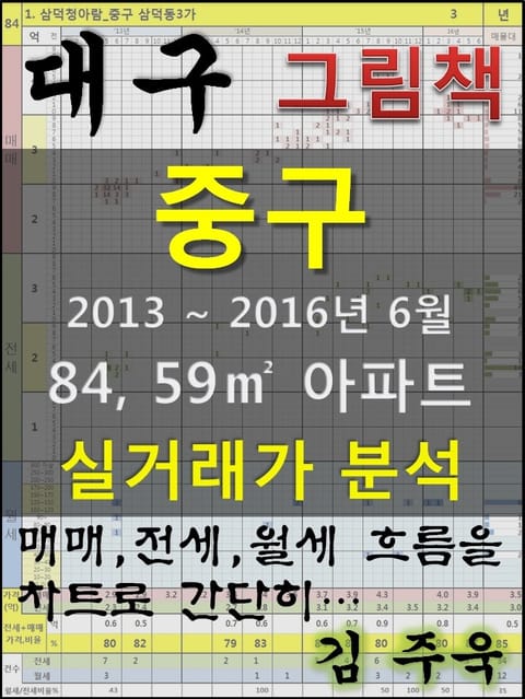 안녕하세요. 김주욱 입니다. 이 책은 그림책입니다. 아파트 가격에 대하여 누구나 쉽게 이해할 수 있도록, 그림으로 나타냈습니다. 복잡한 문장이 아닌 해당 아파트에 대한 가격 흐름을 그림으로 나타내어 누구나 쉽게 살펴 볼 수있고, 본인이 직접 판단할 수 있도록 만들었습니다. 이 책을 보고 좋은 투자를 하시는 것도 좋지만, 나쁜 투자를 하지 않는 것이 더 큰 성과라고 생각합니다. 그릇된 투자로 자금이 고갈되고, 심적 고통을 받는 것 보다 간단히 확인함으로써, 그것을 피할 수 있다는 것이 가장 중요하다고 생각합니다. 해당 아파트에 대한 분석 의견은 수록하지 않았습니다. 타인의 재산에 대하여 평가를 한다는 것 자체가 큰 부담이 되어, 투자의견은 없다는 점 양해 바랍니다. 하지만, 이 책의 차트를 계속 보게되면, 어디를 공략해야 할지 쉽게 알 수 있을 것입니다. 아파트는 주거의 대상일 뿐 아니라 투자의 대상이기도 합니다. 여러분이 관심 있는 아파트의 가격 흐름을 살펴 보시고, 어떤 방향으로 접근해야할지 한번 생각해 보시기 바랍니다. 흔히 가격은 모든 것이 집결 된 종합 예술이라고 합니다. 요즘 아파트의 선정기준은 입지, 교육, 교통, 문화, 쇼핑 등 모든 것이 반영 되어 있습니다. 단 한권의 책으로 그 모든 것을 기술하기에는 내용이 너무 많고, 사실 그렇게 해봤자 정리가 잘되지 않습니다. 이에, 가격의 흐름을 통해서 어떤 방향으로 움직이는지, 앞으로 어떤 방향으로 전개될 것인지 생각해 보시기 바랍니다. 어려운 용어와 긴 문장으로 현상을 자세히 설명하는 것도 좋지만, 저는 단지 가격 흐름을 시각적으로 보여드리겠습니다. 아주 간단한 차트 한 장으로 특정 아파트의 분위기를 느껴 보시기 바랍니다. 여러분이 관심있는 곳 뿐만아닌 유사한 아파트도 참조하시어 현명한 선택을 하시길 바랍니다. ※주의. 본 자료는 실거래가 사이트에서 제공하고 있는 계약일 기준 자료로 통계자료 활용시에는 수치가 왜곡될 수 있으니 참고자료로만 활용하시기 바라며, 외부 공개시에는 반드시 신고일 기준으로 집계되는 공식통계를 이용하여 주시기 바랍니다. 1. 삼덕청아람_중구 삼덕동3가 2. 센트로팰리스_중구 대봉동 3. 극동스타클래스남산_중구 남산동 4. 반월당효성해링턴플레이스_중구 남산동 5. 남산휴먼시아2단지_중구 남산동 6. 태왕아너스스카이_중구 대신동 7. 남산그린타운_중구 남산동 8. 대봉화성파크드림_중구 대봉동 9. 봉산뜨란채_중구 봉산동 10. 동인동삼정그린코아_중구 동인동4가 11. 반월당삼정그린코아_중구 남산동 12. 보성황실타운_중구 남산동 13. 청운맨션_중구 대봉동 14. 허브스카이_중구 남산동 15. 송림맨션_중구 남산동 16. 청구맨션_중구 대봉동 17. 동서_중구 대신동 18. 삼익맨션_중구 대봉동 19. 시티타운_중구 동인동1가 20. 동산맨션_중구 동산동 21. 삼승슈퍼타워_중구 동인동1가 22. 석우리치타운_중구 동산동 23. 까치_중구 남산동 24. 광명_중구 대신동 25. 태평라이프_중구 태평로1가