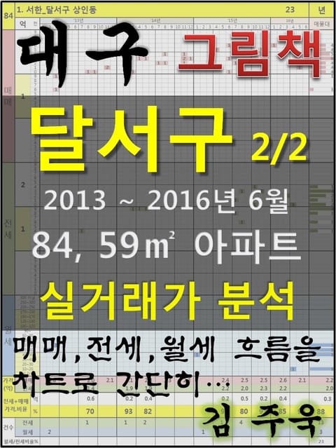 안녕하세요. 김주욱 입니다. 이 책은 그림책입니다. 아파트 가격에 대하여 누구나 쉽게 이해할 수 있도록, 그림으로 나타냈습니다. 복잡한 문장이 아닌 해당 아파트에 대한 가격 흐름을 그림으로 나타내어 누구나 쉽게 살펴 볼 수있고, 본인이 직접 판단할 수 있도록 만들었습니다. 이 책을 보고 좋은 투자를 하시는 것도 좋지만, 나쁜 투자를 하지 않는 것이 더 큰 성과라고 생각합니다. 그릇된 투자로 자금이 고갈되고, 심적 고통을 받는 것 보다 간단히 확인함으로써, 그것을 피할 수 있다는 것이 가장 중요하다고 생각합니다. 해당 아파트에 대한 분석 의견은 수록하지 않았습니다. 타인의 재산에 대하여 평가를 한다는 것 자체가 큰 부담이 되어, 투자의견은 없다는 점 양해 바랍니다. 하지만, 이 책의 차트를 계속 보게되면, 어디를 공략해야 할지 쉽게 알 수 있을 것입니다. 아파트는 주거의 대상일 뿐 아니라 투자의 대상이기도 합니다. 여러분이 관심 있는 아파트의 가격 흐름을 살펴 보시고, 어떤 방향으로 접근해야할지 한번 생각해 보시기 바랍니다. 흔히 가격은 모든 것이 집결 된 종합 예술이라고 합니다. 요즘 아파트의 선정기준은 입지, 교육, 교통, 문화, 쇼핑 등 모든 것이 반영 되어 있습니다. 단 한권의 책으로 그 모든 것을 기술하기에는 내용이 너무 많고, 사실 그렇게 해봤자 정리가 잘되지 않습니다. 이에, 가격의 흐름을 통해서 어떤 방향으로 움직이는지, 앞으로 어떤 방향으로 전개될 것인지 생각해 보시기 바랍니다. 어려운 용어와 긴 문장으로 현상을 자세히 설명하는 것도 좋지만, 저는 단지 가격 흐름을 시각적으로 보여드리겠습니다. 아주 간단한 차트 한 장으로 특정 아파트의 분위기를 느껴 보시기 바랍니다. 여러분이 관심있는 곳 뿐만아닌 유사한 아파트도 참조하시어 현명한 선택을 하시길 바랍니다. ※주의. 본 자료는 실거래가 사이트에서 제공하고 있는 계약일 기준 자료로 통계자료 활용시에는 수치가 왜곡될 수 있으니 참고자료로만 활용하시기 바라며, 외부 공개시에는 반드시 신고일 기준으로 집계되는 공식통계를 이용하여 주시기 바랍니다. 1. 서한_달서구 상인동 2. 성당보성_달서구 본리동 3. 성서3동서_달서구 이곡동 4. 장기파랑새(화성)_달서구 장기동 5. 아카시아_달서구 본리동 6. 월성우방타운_달서구 월성동 7. 현대_달서구 상인동 8. 진천월성위너파크_달서구 진천동 9. 마드리드_달서구 본동 10. 월배귀빈타운2_달서구 진천동 11. 서한맨션_달서구 월성동 12. 용산2서한화성_달서구 용산동 13. 화성맨션_달서구 유천동 14. 상인성지한서타운_달서구 상인동 15. 대곡청구_달서구 대곡동 16. 현대백조타운_달서구 본리동 17. 성당우방_달서구 본리동 18. 벽산타워_달서구 두류동 19. 상인중석타운_달서구 상인동 20. 라일락_달서구 성당동 21. 감삼우방맨션_달서구 감삼동 22. 송현화정리치타운_달서구 송현동 23. 명가(187-5)_달서구 송현동 24. 본리메트로파크_달서구 본리동 25. 선빌파크타운_달서구 두류동 26. 센텀시티_달서구 송현동 27. 성서동서서한_달서구 이곡동 28. 제림_달서구 상인동 29. 대곡우방타운_달서구 대곡동 30. 그린맨션2차_달서구 본동 31. 상인평광_달서구 상인동 32. 용산영남_달서구 용산동 33. 월배동화타운_달서구 대곡동 34. 진천현대_달서구 진천동 35. 성창리젠시_달서구 대천동 36. 월성화성타운_달서구 월성동 37. 두류보성맨션_달서구 두류동 38. 세정드림타운_달서구 상인동 39. 세광그린타운_달서구 진천동 40. 송현제림_달서구 송현동 41. 우방맨션_달서구 진천동 42. 우방맨션_달서구 송현동 43. 성당제림하이츠106_달서구 성당동 44. 보라_달서구 상인동 45. 금강1차단지_달서구 대곡동 46. 제림하나로_달서구 진천동 47. 동서송현해맞이_달서구 송현동 48. 진천대동_달서구 진천동 49. 현대(262-2)_달서구 진천동 50. 귀빈1차_달서구 진천동 51. 대금로얄_달서구 진천동 52. 월성동서_달서구 월성동 53. 세븐하이츠_달서구 용산동 54. 대구성서4주공_달서구 이곡동 55. 동백맨션_달서구 진천동 56. 상인한서_달서구 상인동 57. 성당에덴타운_달서구 성당동 58. 상인아트빌리지_달서구 상인동 59. 본리드림뷰_달서구 본리동 60. 장원트윈빌한솔동_달서구 대곡동 61. 감삼보성청실_달서구 감삼동 62. 한빛마을(성서주공3차)_달서구 이곡동 63. 아람마을_달서구 도원동 64. 성서5주공_달서구 용산동 65. 성서6주공_달서구 용산동 66. 성서와룡타운_달서구 이곡동 67. 금강2차단지_달서구 대곡동 68. 삼미타운_달서구 상인동 69. 하나로명사마을_달서구 진천동 70. 가람마을_달서구 도원동 71. 성지타운_달서구 용산동 72. 성서대백창신한라타운_달서구 이곡동 73. 한양은하_달서구 상인동 74. 보성산호_달서구 상인동 75. 목화미르하이츠A동_달서구 본동 76. 삼영로얄팔레스101_달서구 진천동 77. 동방낙원_달서구 상인동 78. 창현아이빌_달서구 본동 79. 태양골든타운_달서구 본리동 80. 세신하이빌_달서구 본리동 81. 시영은행_달서구 상인동 82. 성창_달서구 감삼동 83. 황실_달서구 성당동 84. 황실_달서구 성당동 85. 달맞이맨션_달서구 진천동 86. 트원아크로파트_달서구 본리동 87. 감삼아크로빌103_달서구 감삼동 88. 별메마을_