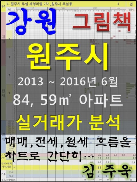 안녕하세요. 김주욱 입니다. 이 책은 그림책입니다. 아파트 가격에 대하여 누구나 쉽게 이해할 수 있도록, 그림으로 나타냈습니다. 복잡한 문장이 아닌 해당 아파트에 대한 가격 흐름을 그림으로 나타내어 누구나 쉽게 살펴 볼 수있고, 본인이 직접 판단할 수 있도록 만들었습니다. 이 책을 보고 좋은 투자를 하시는 것도 좋지만, 나쁜 투자를 하지 않는 것이 더 큰 성과라고 생각합니다. 그릇된 투자로 자금이 고갈되고, 심적 고통을 받는 것 보다 간단히 확인함으로써, 그것을 피할 수 있다는 것이 가장 중요하다고 생각합니다. 해당 아파트에 대한 분석 의견은 수록하지 않았습니다. 타인의 재산에 대하여 평가를 한다는 것 자체가 큰 부담이 되어, 투자의견은 없다는 점 양해 바랍니다. 하지만, 이 책의 차트를 계속 보게되면, 어디를 공략해야 할지 쉽게 알 수 있을 것입니다. 아파트는 주거의 대상일 뿐 아니라 투자의 대상이기도 합니다. 여러분이 관심 있는 아파트의 가격 흐름을 살펴 보시고, 어떤 방향으로 접근해야할지 한번 생각해 보시기 바랍니다. 흔히 가격은 모든 것이 집결 된 종합 예술이라고 합니다. 요즘 아파트의 선정기준은 입지, 교육, 교통, 문화, 쇼핑 등 모든 것이 반영 되어 있습니다. 단 한권의 책으로 그 모든 것을 기술하기에는 내용이 너무 많고, 사실 그렇게 해봤자 정리가 잘되지 않습니다. 이에, 가격의 흐름을 통해서 어떤 방향으로 움직이는지, 앞으로 어떤 방향으로 전개될 것인지 생각해 보시기 바랍니다. 어려운 용어와 긴 문장으로 현상을 자세히 설명하는 것도 좋지만, 저는 단지 가격 흐름을 시각적으로 보여드리겠습니다. 아주 간단한 차트 한 장으로 특정 아파트의 분위기를 느껴 보시기 바랍니다. 여러분이 관심있는 곳 뿐만아닌 유사한 아파트도 참조하시어 현명한 선택을 하시길 바랍니다. ※주의. 본 자료는 실거래가 사이트에서 제공하고 있는 계약일 기준 자료로 통계자료 활용시에는 수치가 왜곡될 수 있으니 참고자료로만 활용하시기 바라며, 외부 공개시에는 반드시 신고일 기준으로 집계되는 공식통계를 이용하여 주시기 바랍니다. 1. 원주시 무실 세영리첼 2차 _원주시 무실동 2. 힐데스하임 5단지_원주시 반곡동 3. 원주시 무실 세영리첼 1차_원주시 무실동 4. 무실우미린_원주시 무실동 5. 푸른숨엘에이치4단지_원주시 반곡동 6. 원주반곡아이파크_원주시 반곡동 7. 봉화산e-편한세상_원주시 단계동 8. 원주무실6단지휴먼시아_원주시 무실동 9. 푸른숨엘에이치11단지_원주시 반곡동 10. 개운1차한신휴플러스_원주시 개운동 11. 개운2차한신휴플러스_원주시 단구동 12. 한라비발디2차_원주시 우산동 13. 휴먼시아 원주개운1단지_원주시 개운동 14. 효성백년가약_원주시 행구동 15. 현진에버빌6차_원주시 단구동 16. 현진에버빌5차_원주시 단구동 17. 남원주두산위브_원주시 흥업면 흥업리 18. 무실뜨란채_원주시 무실동 19. 한라비발디_원주시 우산동 20. 행구금강아미움아파트_원주시 행구동 21. 반곡벽산2차아파트_원주시 반곡동 22. 중앙하이츠아파트_원주시 단구동 23. 신성미소지움_원주시 단구동 24. 단계동이안(1166-0)_원주시 단계동 25. 반곡벽산블루밍1차_원주시 반곡동 26. 원주신일유토빌_원주시 우산동 27. 베스파타운무실주공4_원주시 무실동 28. 한솔솔파크_원주시 명륜동 29. 단계동이안(1165-0)_원주시 단계동 30. 현진에버빌4차_원주시 관설동 31. 현진에버빌_원주시 단구동 32. 요진보네르카운티2차_원주시 태장동 33. 동보노빌리티타워_원주시 단구동 34. 유승_원주시 단구동 35. 극동스타클래스_원주시 문막읍 건등리 36. 코아루_원주시 관설동 37. 동보노빌리티1_원주시 명륜동 38. 원주문막신원아침도시_원주시 문막읍 동화리 39. 무실주공3단지_원주시 무실동 40. 세경웰러스_원주시 단구동 41. 성원_원주시 명륜동 42. 코오롱_원주시 단계동 43. 아포리배말타운_원주시 봉산동 44. 흥화브라운빌_원주시 태장동 45. 청구2_원주시 명륜동 46. 구곡2현대_원주시 단구동 47. 금광포란재1단지_원주시 태장동 48. 성호2차샤인힐즈_원주시 태장동 49. 현진에버빌2_원주시 단구동 50. 삼익_원주시 단계동 51. 동신_원주시 봉산동 52. 대림_원주시 단구동 53. 현대_원주시 행구동 54. 단계롯데_원주시 단계동 55. 성일_원주시 단계동 56. 현대1_원주시 단구동 57. 성일_원주시 단구동 58. 한일_원주시 단구동 59. 건영_원주시 행구동 60. 태장동보렉스(8차)_원주시 태장동 61. 동성_원주시 명륜동 62. 현대2_원주시 명륜동 63. 원흥4_원주시 단구동 64. 현대3_원주시 단계동 65. 태장주공1단지_원주시 태장동 66. 개운현대_원주시 개운동 67. 덕산_원주시 개운동 68. 청솔8차_원주시 관설동 69. 청솔7차_원주시 단구동 70. 삼익_원주시 봉산동 71. 현대_원주시 태장동 72. 대흥_원주시 단구동 73. 현대1_원주시 명륜동 74. 장미_원주시 단계동 75. 태봉우성2_원주시 태장동 76. 현진_원주시 원동 77. 현진_원주시 단계동 78. 삼성_원주시 명륜동 79. 해청_원주시 단구동 80. 영진로얄맨션_원주시 학성동 81. 청솔5차_원주시 관설동 82. 청솔2차_원주시 단구동 83. 청솔6차_원주시 관설동 84. 대흥2_원주시 태장동 85. 일산국제_원주시 일산동 86. 태장주공2_원주시 
