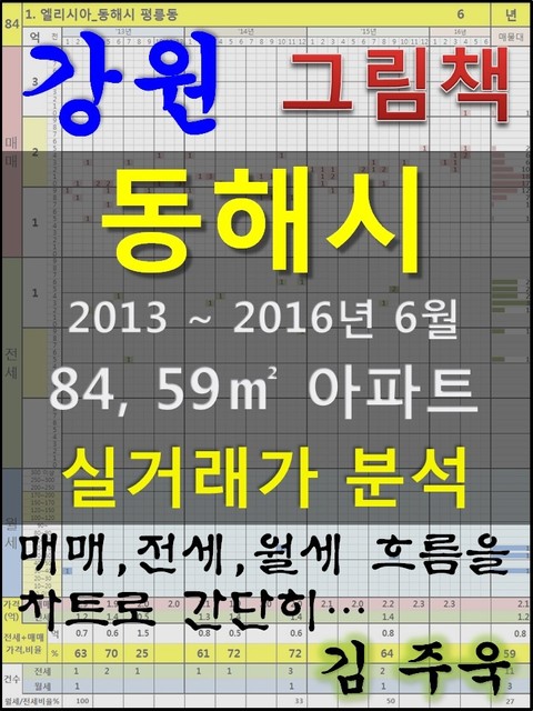 안녕하세요. 김주욱 입니다. 이 책은 그림책입니다. 아파트 가격에 대하여 누구나 쉽게 이해할 수 있도록, 그림으로 나타냈습니다. 복잡한 문장이 아닌 해당 아파트에 대한 가격 흐름을 그림으로 나타내어 누구나 쉽게 살펴 볼 수있고, 본인이 직접 판단할 수 있도록 만들었습니다. 이 책을 보고 좋은 투자를 하시는 것도 좋지만, 나쁜 투자를 하지 않는 것이 더 큰 성과라고 생각합니다. 그릇된 투자로 자금이 고갈되고, 심적 고통을 받는 것 보다 간단히 확인함으로써, 그것을 피할 수 있다는 것이 가장 중요하다고 생각합니다. 해당 아파트에 대한 분석 의견은 수록하지 않았습니다. 타인의 재산에 대하여 평가를 한다는 것 자체가 큰 부담이 되어, 투자의견은 없다는 점 양해 바랍니다. 하지만, 이 책의 차트를 계속 보게되면, 어디를 공략해야 할지 쉽게 알 수 있을 것입니다. 아파트는 주거의 대상일 뿐 아니라 투자의 대상이기도 합니다. 여러분이 관심 있는 아파트의 가격 흐름을 살펴 보시고, 어떤 방향으로 접근해야할지 한번 생각해 보시기 바랍니다. 흔히 가격은 모든 것이 집결 된 종합 예술이라고 합니다. 요즘 아파트의 선정기준은 입지, 교육, 교통, 문화, 쇼핑 등 모든 것이 반영 되어 있습니다. 단 한권의 책으로 그 모든 것을 기술하기에는 내용이 너무 많고, 사실 그렇게 해봤자 정리가 잘되지 않습니다. 이에, 가격의 흐름을 통해서 어떤 방향으로 움직이는지, 앞으로 어떤 방향으로 전개될 것인지 생각해 보시기 바랍니다. 어려운 용어와 긴 문장으로 현상을 자세히 설명하는 것도 좋지만, 저는 단지 가격 흐름을 시각적으로 보여드리겠습니다. 아주 간단한 차트 한 장으로 특정 아파트의 분위기를 느껴 보시기 바랍니다. 여러분이 관심있는 곳 뿐만아닌 유사한 아파트도 참조하시어 현명한 선택을 하시길 바랍니다. ※주의. 본 자료는 실거래가 사이트에서 제공하고 있는 계약일 기준 자료로 통계자료 활용시에는 수치가 왜곡될 수 있으니 참고자료로만 활용하시기 바라며, 외부 공개시에는 반드시 신고일 기준으로 집계되는 공식통계를 이용하여 주시기 바랍니다. 1. 엘리시아_동해시 평릉동 2. 코아루디오션_동해시 평릉동 3. 동아더프라임1단지_동해시 효가동 4. 동해금호어울림_동해시 천곡동 5. 동아더프라임2단지_동해시 효가동 6. 푸르지오_동해시 평릉동 7. 북삼코아루_동해시 동회동 8. 센트로빌_동해시 천곡동 9. 현대4차_동해시 동회동 10. 현대5차_동해시 동회동 11. 동해석미모닝파크_동해시 쇄운동 12. 대동1,2차_동해시 동회동 13. 한양2차_동해시 천곡동 14. 동아_동해시 천곡동 15. 현대1차_동해시 천곡동 16. 대동3차_동해시 동회동 17. 현대_동해시 이도동 18. 삼성_동해시 천곡동 19. 쌍용_동해시 천곡동 20. 롯데_동해시 천곡동 21. 선샤인파크_동해시 부곡동 22. 한양1차_동해시 천곡동 23. 이도2주공_동해시 이도동 24. 삼성_동해시 발한동 25. 아름다운아침_동해시 쇄운동 26. 일정골든타워_동해시 부곡동 27. 협성2차_동해시 동회동 28. 천곡주공3차_동해시 천곡동 29. 유공타워_동해시 천곡동 30. 범주성지_동해시 용정동 31. 명보2차_동해시 효가동 32. 유존_동해시 부곡동 33. 동해프라자_동해시 발한동 34. 협성1차_동해시 동회동 35. 시영1차_동해시 천곡동 36. 승우_동해시 용정동 37. 현진_동해시 구미동 38. 강변_동해시 이도동 39. 삼정상가2차_동해시 부곡동 40. 범주성지(가나)_동해시 천곡동 41. 삼화미성_동해시 부곡동 42. 강경_동해시 발한동 43. 대아주택2차_동해시 동회동 44. 경민1차_동해시 발한동