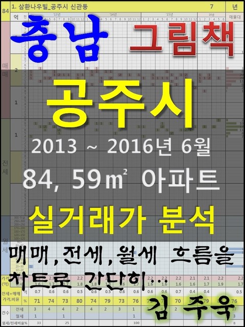 안녕하세요. 김주욱 입니다. 이 책은 그림책입니다. 아파트 가격에 대하여 누구나 쉽게 이해할 수 있도록, 그림으로 나타냈습니다. 복잡한 문장이 아닌 해당 아파트에 대한 가격 흐름을 그림으로 나타내어 누구나 쉽게 살펴 볼 수있고, 본인이 직접 판단할 수 있도록 만들었습니다. 이 책을 보고 좋은 투자를 하시는 것도 좋지만, 나쁜 투자를 하지 않는 것이 더 큰 성과라고 생각합니다. 그릇된 투자로 자금이 고갈되고, 심적 고통을 받는 것 보다 간단히 확인함으로써, 그것을 피할 수 있다는 것이 가장 중요하다고 생각합니다. 해당 아파트에 대한 분석 의견은 수록하지 않았습니다. 타인의 재산에 대하여 평가를 한다는 것 자체가 큰 부담이 되어, 투자의견은 없다는 점 양해 바랍니다. 하지만, 이 책의 차트를 계속 보게되면, 어디를 공략해야 할지 쉽게 알 수 있을 것입니다. 아파트는 주거의 대상일 뿐 아니라 투자의 대상이기도 합니다. 여러분이 관심 있는 아파트의 가격 흐름을 살펴 보시고, 어떤 방향으로 접근해야할지 한번 생각해 보시기 바랍니다. 흔히 가격은 모든 것이 집결 된 종합 예술이라고 합니다. 요즘 아파트의 선정기준은 입지, 교육, 교통, 문화, 쇼핑 등 모든 것이 반영 되어 있습니다. 단 한권의 책으로 그 모든 것을 기술하기에는 내용이 너무 많고, 사실 그렇게 해봤자 정리가 잘되지 않습니다. 이에, 가격의 흐름을 통해서 어떤 방향으로 움직이는지, 앞으로 어떤 방향으로 전개될 것인지 생각해 보시기 바랍니다. 어려운 용어와 긴 문장으로 현상을 자세히 설명하는 것도 좋지만, 저는 단지 가격 흐름을 시각적으로 보여드리겠습니다. 아주 간단한 차트 한 장으로 특정 아파트의 분위기를 느껴 보시기 바랍니다. 여러분이 관심있는 곳 뿐만아닌 유사한 아파트도 참조하시어 현명한 선택을 하시길 바랍니다. ※주의. 본 자료는 실거래가 사이트에서 제공하고 있는 계약일 기준 자료로 통계자료 활용시에는 수치가 왜곡될 수 있으니 참고자료로만 활용하시기 바라며, 외부 공개시에는 반드시 신고일 기준으로 집계되는 공식통계를 이용하여 주시기 바랍니다. 1. 삼환나우빌_공주시 신관동 2. 공주신금우남퍼스트빌_공주시 금흥동 3. 현대힐스테이트5차_공주시 신관동 4. 다숲1단지_공주시 신관동 5. 금학e-편한세상_공주시 금학동 6. 다숲2단지_공주시 신관동 7. 새뜸현대4_공주시 금흥동 8. 현대1차_공주시 신관동 9. 현대2차_공주시 신관동 10. 대아아이투빌_공주시 신관동 11. 새뜸현대_공주시 신관동 12. 주공5차_공주시 신관동 13. 공주교동대우_공주시 교동 14. 대아곰나루_공주시 신관동 15. 한빛_공주시 신관동 16. 배원청실_공주시 웅진동 17. 샹화샤인빌_공주시 교동 18. 주공4단지_공주시 신관동 19. 햇님_공주시 탄천면 송학리 20. 덕성그린타운_공주시 옥룡동 21. 이솔_공주시 신관동 22. 유진한아름_공주시 신관동 23. 대일_공주시 금학동 24. 덕성_공주시 신관동 25. 주공2_공주시 옥룡동 26. 주공2_공주시 신관동 27. 주공1_공주시 신관동 28. 비둘기_공주시 금성동 29. 금강빌라_공주시 옥룡동 30. 신한2차_공주시 의당면 청룡리 31. 청룡신한1차임대_공주시 의당면 청룡리 32. 백제맨션_공주시 옥룡동 33. 화신전원_공주시 유구읍 유구리 34. 동진비둘기_공주시 유구읍 유구리