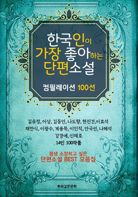한국인이 가장 좋아하는 <단편소설 100선> 평생 소장 단편소설 BEST 모음집! *[컴필레이션 BEST 100선 수록 작품 리스트]* *[김유정] 작품 10편 금따는 콩밭/노다지/동백꽃 두포전/따라지/땡볕/만무방 봄봄/산골 나그네/소낙비 *[김동인] 작품 10편 K박사의 연구/감자/광염 소나타/광화사 발가락이 닮았다/배따라기/붉은 산/사진과 편지 술값 외상/어머니 곰네 *[이상] 작품 10편 공포의 기록/날개/동해(童骸) /봉별기(逢別記) 실낙원/권태/종생기/지도의 암실/지주회시/지팽이 역사 *[나도향] 작품 10편 계집 하인/당착(撞着)/물레방아 벙어리 삼룡이/별을 안거든 울지나 말걸/뽕 여이발사/옛날 꿈은 창백하더이다/젊은이의 시절/행랑자식 *[현진건] 작품 10편 B사감과 러브레터/고향/까막잡기 빈처/술 권하는 사회/신문지와 철창/운수 좋은 날 유린(蹂躪)/피아노/할머니의 죽음 *[이효석] 작품 10편 기우/도시와 유령/돈(豚)/메밀꽃 필 무렵 분녀/수난/수탉/약령기(弱齡記)/장미 병들다 행진곡(行進曲) *[채만식] 작품 10편 논이야기/레디메이드 인생/미스터 방 반점(斑點)/사호 일단(四號一段)/세 길로 쑥국새/댕동어/치숙(痴叔)/낙조 *[이광수] 작품 10편 길놀이/난제오(亂啼烏)/소년의 비애(少年의 悲哀) 모르는 여인/무명(無明)/방황(彷徨)/어떤 아침 유정(有情)/윤광호(尹光浩)/할멈 *[계용묵] 작품 10편 상환/최서방/인두지주/백치 아다다/청춘도 병풍 속에 그린 닭이/유앵기/신기루/별을 헨다 바람은 그냥 불고 *[이인직] 작품 3편 혈의 누/치악산/은세계 *[안국선] 작품 1편 금수회의록(禽獸會議錄) *[강경애] 작품 1편 어머니와 딸 *[나혜석] 작품 1편 경희 *[신채호] 작품 1편 용과 용의 대격전 "말이 사람을 표현하듯, 문학은 사회를 표현한다. & 인간이 타락했을 때에만 문학이 타락한다."