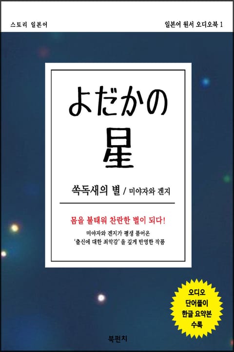하루 10분, 일본어 어휘도 익히고 문학도 감상하는 일본어 원서 읽기! 본서는 초급일본어를 공부한 학습자가 중급실력의 일본어를 학습할 수 있도록 구성한 책이다. 한자도 익히고 생활 어휘, 독해 능력도 함께 향상되는 학습효과도 기대할 수 있다. 원서 읽기에 도움을 주고자 단어풀이와 한글 요약본, 원어민이 읽어주는 오디오를 수록하였다. 단시간에 어학 실력이 향상되기란 무척 어렵다. 하지만 하루 10분씩, 꾸준히 원서를 읽다 보면 자신도 모르게 어휘 및 독해 실력이 향상될 것이다. 아무쪼록 여러분의 일본어 공부에 도움이 되길 바란다. 몸을 불태워 찬란한 별이 되다! 볼품없는 외모로 괴롭힘을 당하는 쏙독새가 무리를 떠나 별이 되고자 분투하는 과정을 그린 이야기이다. 일본 국어의 교과서에도 채택된 유명한 작품이다. 강자의 괴롭힘과 외모 차별에 대한 교훈적인 내용이 중심이지만 자신의 ‘존재’에의 죄악감에서 벗어나 몸을 불태워 별이 된다는 쏙독새의 모습은 미야자와 겐지의 불교사상과 상통한다. 그가 평생 품어온 ‘출신에 대한 죄악감’을 깊게 반영한 작품이라 할 수 있다.