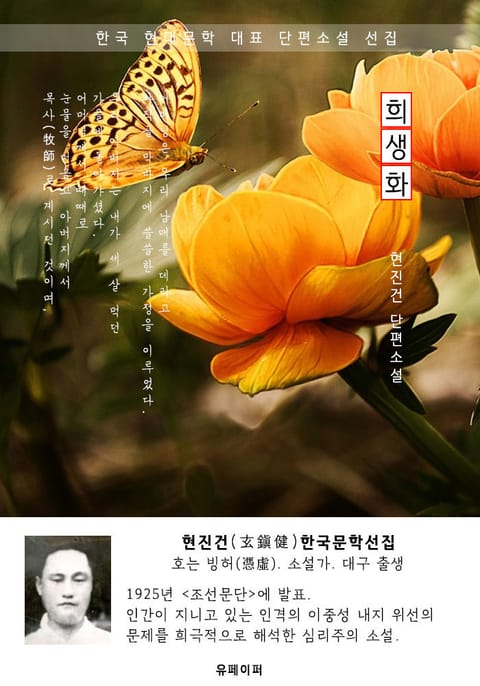 희생화 - 현진건 한국문학선집 * 도서 구성 및 독자 대상 -첫째, (고품격) 현대 문법 정리(띄어쓰기 및 현대어 적용) -둘째, 한국 근/현대 문학 대표작 선집(한국인 사랑하는 대표 단편소설) -셋째, 국어 교과서 수록 작품(초/중/고등학생 및 남녀노소 필독서) -넷째, 현진건(玄鎭健)작가/작품 소개 -다섯째, 현진건 작품 이외 3편 추가 수록 *현진건(玄鎭健) 한국문학선집 호는 빙허(憑虛). 소설가. 대구 출생. 도쿄 독일어학교를 졸업. 치밀한 관찰과 섬세한 묘사로 한국 사실주의 문학의 극치를 보여주었다. 그는 당시 '한국의 모파상'이라 불릴 만큼 리얼하고 치밀한 묘사로 한국소설의 리얼리즘을 개척하는 데 크게 이바지했다. 일제 강점기하의 민족의 수난적 운명에 대한 객관적인 현실 묘사를 지향한 리얼리즘의 선구자로 꼽힌다. *희생화 -내용- 어머님은 우리 남매를 데리고 사직골 막바지에 쓸쓸한 가정을 이루었다. 우리 아버지는 내가 세 살 먹던 가을에 돌아가셨다. 어머님께서 때때로 눈물을 머금고 아버지께서 목사(牧師)로 계시던 것이며, 그 열렬한 웅변이 죄 많은 사람을 감동시켜 하나님을 믿게 하던 것이며, 자기 몸은 조금도 돌아보지 아니하고 교회 일에 진심갈력(盡心竭力)하던 것을 이야기하신다. 나보다 4년 맏이던 누님은 이 말을 들을적마다 그 맑고 고운 눈에 눈물이 어리었다. 철 모르는 나는 그 이야기보다 어머님과 누님이 우는 것이 슬퍼서 눈물을 흘리었다. 집안은 넉넉지는 아니하나마 많지 않은 식구라 아버지 생전에 장만하여 주신 몇 섬지기나 추수하는 것으로 기한(飢寒)은 면할 수 있었다. 아버지의 감화인지는 모르나 어머님은 우리 남매를 학교에 다니게 하였다. 벌써 십여 년 전 일이라 누님 공부시키는 데 대하여 별별 비평이 다 많았다. 그러나 어머님은 무슨 까닭에 여자 교육이 필요한 것인지는 모르겠지마는 아마 여자도 교육시키는 것이 좋은 줄로 아신 것 같다.