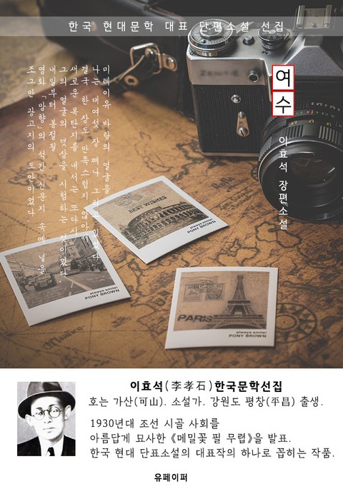 여수(旅愁) - 이효석 한국문학선집 * 도서 구성 및 독자 대상 -첫째, (고품격) 현대 문법 정리(띄어쓰기 및 현대어 적용) -둘째, 한국 근/현대 문학 대표작 선집(한국인 사랑하는 대표 단편소설) -셋째, 국어 교과서 수록 작품(초/중/고등학생 및 남녀노소 필독서) -넷째, 이효석(李孝石) 작가/작품 소개 -다섯째, 이효석 작품 이외 3편 추가 수록 * 이효석(李孝石) 한국문학선집 (1907년 2월 23일 ∼ 1942년 5월 25일) 일제 강점기의 작가, 언론인, 수필가, 시인이다. 한때 숭실전문학교의 교수를 지내기도 했다. 호는 가산(可山)이며, 강원 평창(平昌) 출생으로 한국의 대표적인 단편소설 작가이다. 이효석 문학의 황금시대라 할 수 있다. 체호프·맨스필드·싱그·로렌스·켓셀 등 외국 작가로부터 영향을 받아, 진정한 서구적 현대성을 문학으로써 구상화하여 단편소설의 예술성과 기법면에 신경지를 개척하였다. * 여수(旅愁) -내용- 미레이유 바랑의 얼굴을 나는 대여섯 장 째나 그리고 있었다. 결국 한 장도 만족스럽지 않아서 새로운 목탄지를 내서는 또다시 그의 얼굴의 뎃상을 시험하는 것이었다. 내일부터 봉절될 영화 「망향」의 석간 신문지 속에 넣을 조그만 광고지의 도안이었다. 별이 총총히 빛나는 하늘을 배경으로 바랑과 갸방의 얼굴을 그리고 그 속에 출연자의 스태프와 자극적인 광고문을 넣자는 고안이었으나 광고문은커녕 나는 바랑의 얼굴에서 그만 막혀 버린 것이 좀체 운필이 뜻대로 되지는 않아 마음이 초조하고 답답해지기 시작했다. “여배우 얼굴 하나 가지구 벌써 몇 시간을 잡아먹나. 얼른 끝을 내야 인쇄소에 넘겨 저녁때까지에 박아내지 않겠나.” 맞은편에 책상을 마주대고 앉은 동료는 나의 궁싯거리는 양이 보기 민망해서 기어코 자리를 일어선다. “웬일인지 모르겠네. 그리다 그리다 이렇게 막힐 법은 없어. 고 눈과 코가 종시 말을 들어야 말이지.” 동료는 등뒤로 돌아오더니 어깨너머로 내 그림을 바라보며, “자넨 벌써 바랑과 연앤가.” “연애라니.” “암, 연애구 말구. 그렇게 망설이는 자네 마음이 심상치 않어.” 쓸데없는 말을 걸어온 까닭에 결국 망쳐 버리고야 말았다. “연애!”