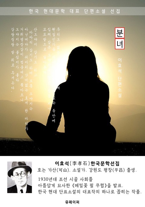 분녀 - 이효석 한국문학선집 * 도서 구성 및 독자 대상 -첫째, (고품격) 현대 문법 정리(띄어쓰기 및 현대어 적용) -둘째, 한국 근/현대 문학 대표작 선집(한국인 사랑하는 대표 단편소설) -셋째, 국어 교과서 수록 작품(초/중/고등학생 및 남녀노소 필독서) -넷째, 이효석(李孝石) 작가/작품 소개 -다섯째, 이효석 작품 이외 3편 추가 수록 * 이효석(李孝石) 한국문학선집 (1907년 2월 23일 ∼ 1942년 5월 25일) 일제 강점기의 작가, 언론인, 수필가, 시인이다. 한때 숭실전문학교의 교수를 지내기도 했다. 호는 가산(可山)이며, 강원 평창(平昌) 출생으로 한국의 대표적인 단편소설 작가이다. 이효석 문학의 황금시대라 할 수 있다. 체호프·맨스필드·싱그·로렌스·켓셀 등 외국 작가로부터 영향을 받아, 진정한 서구적 현대성을 문학으로써 구상화하여 단편소설의 예술성과 기법면에 신경지를 개척하였다. * 분녀 -내용- 우리도 없는 농장에 아닌때 웬일인가들 의아하게 여기고 있는 동안에 집채 같은 도야지는 헛간 앞을 지나 묘포밭으로 달아온다. 산도야지 같기도 하고 마바리 같기도 하여 보통 도야지는 아닌데다가 뒤미처 난데없는 호개 한 마리가 거위영장같이 껑충대고 쫓아오니 도야지는 불심지가 올라 갈팡질팡 밭 위로 우겨든다. 풀 뽑던 동무들은 간담이 써늘하여 꽁무니가 빠져라 산지사방으로 달아난다. 허구많은 지향 다 두고 도야지는 굳이 이쪽을 겨누고 욱박아 오는 것이다. 분녀는 기겁을 하고 도망을 하나 아무리 애써도 발이 재게 떨어지지 않는다. 신이 빠지고 허리가 휘는데 엎친 데 덮치기로 공칙히 앞에는 넓은 토벽이 막혀 꼼짝 부득이다. 옆으로 빗빼려고 하는 서슬에 도야지는 앞으로 왈칵 덮친다. 손가락 하나 놀릴 여유도 없다. 육중한 바위 밑에서 금시에 육신이 터지고 사지가 떨어지는 것 같다. 팔을 꼼짝달싹할 수 없고 고함을 치려야 입이 움직이지 않는다. 분녀(粉女)는 질색하여 눈을 떴다. 허리가 뻐근하며 몸이 통세난다.