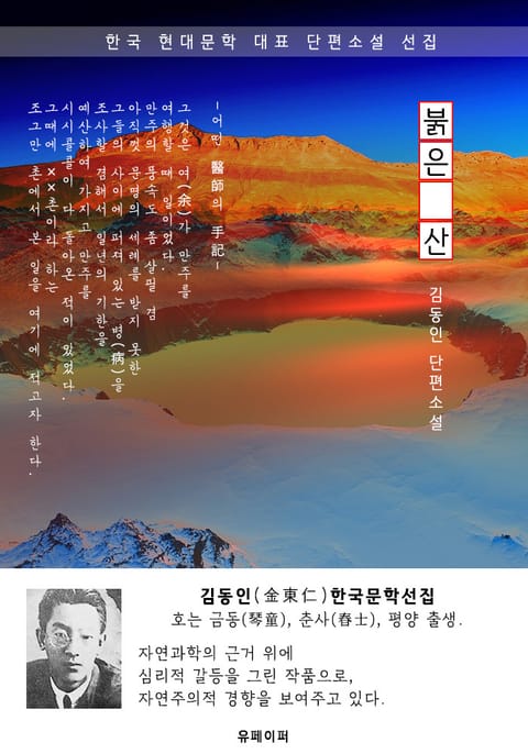 붉은 산 - 김동인 한국문학선집 * 도서 구성 및 독자 대상 -첫째, (고품격) 현대 문법 정리(띄어쓰기 및 현대어 적용) -둘째, 한국 근/현대 문학 대표작 선집(한국인 사랑하는 대표 단편소설) -셋째, 국어 교과서 수록 작품(초/중/고등학생 및 남녀노소 필독서) -넷째, 김동인(金東仁)작가/작품 소개 -다섯째, 김동인 작품 이외 3편 추가 수록 * 김동인(金東仁)한국문학선집 [조선문단]에 발표된 김동인의 단편소설. 인간의 본능과 동물적인 추악한 면을 분석, 현실을 폭로한 전형적인 자연주의 경향의 작품. 평론과 풍자에 능하였으며 한때 문인은 글만 써야된다는 신념을 갖기도 하였다. 일제 강점기부터 나타난 자유 연애와 여성 해방 운동을 반대, 비판하기도 하였다. 현대적인 문체의 단편소설을 발표하여 한국 근대문학의 선구자로 꼽힌다. * 붉은 산 -내용- -어떤 醫師의 手記- 그것은 여(余)가 만주를 여행할 때 일이었다. 만주의 풍속도 좀 살필 겸 아직껏 문명의 세례를 받지 못한 그들의 사이에 퍼져 있는 병(病)을 조사할 겸해서 일년의 기한을 예산하여 가지고 만주를 시시콜콜이 다 돌아온 적이 있었다. 그때에 ××촌이라 하는 조그만 촌에서 본 일을 여기에 적고자 한다. ××촌은 조선사람 소작인만 사는 한 이십여 호 되는 작은 촌이었다. 사면을 둘러보아도 한개의 산도 볼 수가 없는 광막한 만주의 벌판 가운데 놓여 있는 이름도 없는 작은 촌이었다. 몽고사람 종자(從者)를 하나 데리고 노새를 타고 만주의 촌촌을 돌아다니던 여가 그 ××촌에 이른 때는 가을도 다 가고 어느덧 광포한 북극의 겨울이 만주를 찾아온 때였다.
