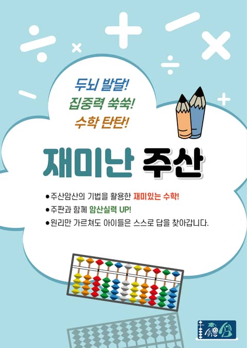 주산은 연산을 쉽고 재밌게 조금은 빨리 풀 수 있도록 도와주는 수단 일 뿐입니다. 부모님께서 이 학습서를 바탕으로 직접 아이에게 지도해보세요! 아이가 스스로 재밌어하고 좋아한다면 분명 수학을 학습하는 데는 도움을 줄 수 있을 것이니 적극 추천합니다. 사칙연산을 처음 배우는 유아, 유치원 아이에게는 수학을 재밌게 배울 수 있는 기회가 될 것이고, 유년, 초등생 아이에게는 암산능력을 키울 수 있는 좋은 기회가 될 것입니다.