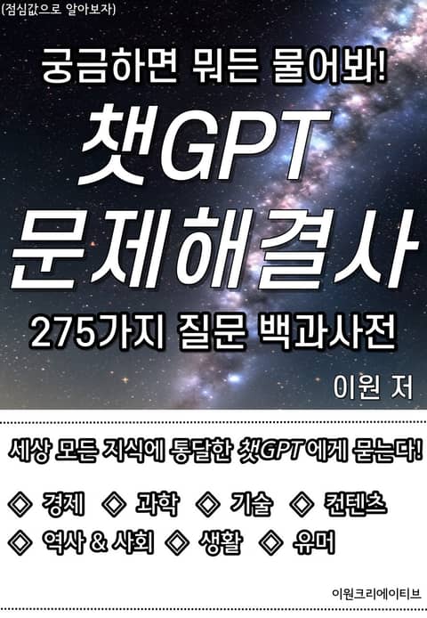 이 책은 최근 전세계 1억 명 이상의 사용자들로부터 인기를 모으고 있는 질문/답변 인공지능 챗GPT에게,