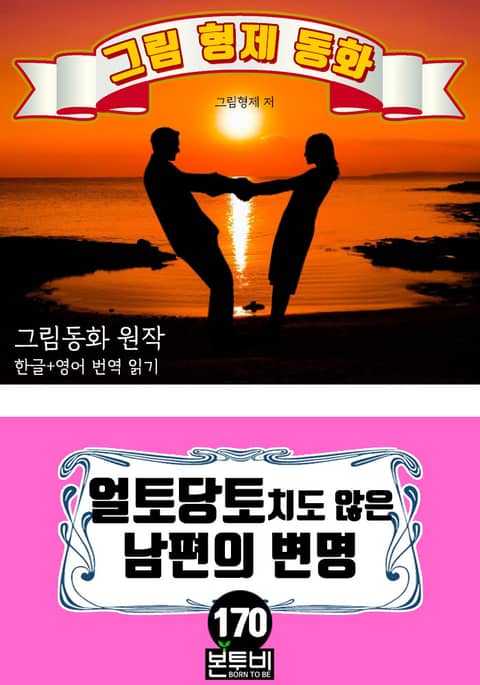 그림형제 동화 170. 얼토당토치도 않은 남편의 변명 그림동화 원작 한글+영어 번역 읽기 - 그림 동화, 한글 번역 수록 - 그림 동화, 영문 번역 수록 독일'그림 형제'가 '여러 전래 민담을 모아서 집필한 동화집으로 원래 제목은 '그림 형제에 의해 수집된 아이들과 가정의 민화'출판을 거듭하면서 새로운 이야기가 추가 되면서 어린이에게 적합하지 않은 성적인 내용과 잔인한 장면 묘사 등이이 삭제되며 총 211개가 수록되었다. 그 가운데에 '백설공주, 잠자는 숲 속의 미녀, 라푼젤, 헨젤과 그레텔, 늑대와 일곱 마리 아기 염소, 개구리 왕자, 브레멘 음악대'와 같이 현재에도 널리 읽히고 있다. <그림 동화> 초판본은 잔혹성과 선정적인 묘사가 자주 등장한다. 비단, 독일 뿐만이 나니라 유럽의 여러나라 그리고 우리나라의 옛 민담도 잔인한 표현이 많다. 현대 사회에 어린이에게 맞지 잔혹성을 <디즈니> 애니메이션을 통해 부적한 묘사를 삭제하고 재구성하여 보여주고 있다. 이러한 그림형제의 동화는 우리에게 잘 알려져 있다. 그림 동화에 숨겨진 의미를 재해석하여 재창조한 이야기는 실제 200년 전의 원작 '그림 동화'와 내용 및 이야기 구조에 거리가 있다. 이번 <그림형제 동화> 시리즈는 독일어로 된 동화를 세계문학으로 전파하기 위해 영어로 번역된 작품을 한글로 번역하였다. 옛날 유럽 전래 민담의 200년 이전 이야기 구조는 '잔혹성, 선정성, 판타지' 등이 그대로 2차 한글, 영어 번역본을 수록했다.