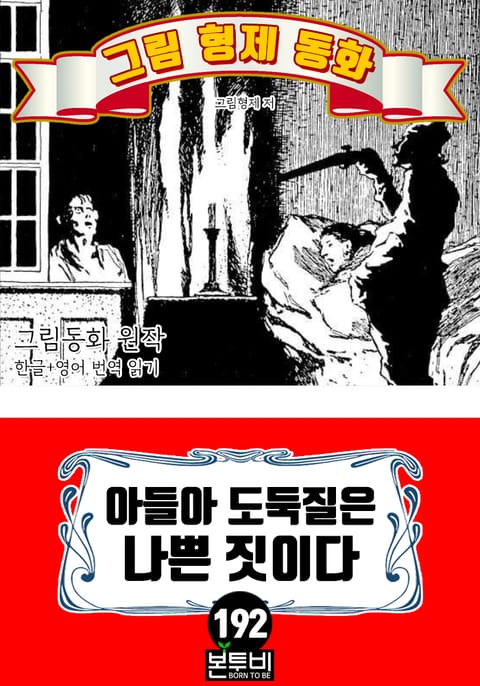 그림형제 동화 192. 아들아 도둑질은 나쁜 짓이다 그림동화 원작 한글+영어 번역 읽기 - 그림 동화, 한글 번역 수록 - 그림 동화, 영문 번역 수록 독일'그림 형제'가 '여러 전래 민담을 모아서 집필한 동화집으로 원래 제목은 '그림 형제에 의해 수집된 아이들과 가정의 민화'출판을 거듭하면서 새로운 이야기가 추가 되면서 어린이에게 적합하지 않은 성적인 내용과 잔인한 장면 묘사 등이이 삭제되며 총 211개가 수록되었다. 그 가운데에 '백설공주, 잠자는 숲 속의 미녀, 라푼젤, 헨젤과 그레텔, 늑대와 일곱 마리 아기 염소, 개구리 왕자, 브레멘 음악대'와 같이 현재에도 널리 읽히고 있다. <그림 동화> 초판본은 잔혹성과 선정적인 묘사가 자주 등장한다. 비단, 독일 뿐만이 나니라 유럽의 여러나라 그리고 우리나라의 옛 민담도 잔인한 표현이 많다. 현대 사회에 어린이에게 맞지 잔혹성을 <디즈니> 애니메이션을 통해 부적한 묘사를 삭제하고 재구성하여 보여주고 있다. 이러한 그림형제의 동화는 우리에게 잘 알려져 있다. 그림 동화에 숨겨진 의미를 재해석하여 재창조한 이야기는 실제 200년 전의 원작 '그림 동화'와 내용 및 이야기 구조에 거리가 있다. 이번 <그림형제 동화> 시리즈는 독일어로 된 동화를 세계문학으로 전파하기 위해 영어로 번역된 작품을 한글로 번역하였다. 옛날 유럽 전래 민담의 200년 이전 이야기 구조는 '잔혹성, 선정성, 판타지' 등이 그대로 2차 한글, 영어 번역본을 수록했다.