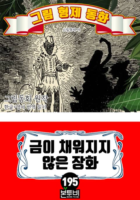 그림형제 동화 195. 금이 채워지지 않은 장화 그림동화 원작 한글+영어 번역 읽기 - 그림 동화, 한글 번역 수록 - 그림 동화, 영문 번역 수록 독일'그림 형제'가 '여러 전래 민담을 모아서 집필한 동화집으로 원래 제목은 '그림 형제에 의해 수집된 아이들과 가정의 민화'출판을 거듭하면서 새로운 이야기가 추가 되면서 어린이에게 적합하지 않은 성적인 내용과 잔인한 장면 묘사 등이이 삭제되며 총 211개가 수록되었다. 그 가운데에 '백설공주, 잠자는 숲 속의 미녀, 라푼젤, 헨젤과 그레텔, 늑대와 일곱 마리 아기 염소, 개구리 왕자, 브레멘 음악대'와 같이 현재에도 널리 읽히고 있다. <그림 동화> 초판본은 잔혹성과 선정적인 묘사가 자주 등장한다. 비단, 독일 뿐만이 나니라 유럽의 여러나라 그리고 우리나라의 옛 민담도 잔인한 표현이 많다. 현대 사회에 어린이에게 맞지 잔혹성을 <디즈니> 애니메이션을 통해 부적한 묘사를 삭제하고 재구성하여 보여주고 있다. 이러한 그림형제의 동화는 우리에게 잘 알려져 있다. 그림 동화에 숨겨진 의미를 재해석하여 재창조한 이야기는 실제 200년 전의 원작 '그림 동화'와 내용 및 이야기 구조에 거리가 있다. 이번 <그림형제 동화> 시리즈는 독일어로 된 동화를 세계문학으로 전파하기 위해 영어로 번역된 작품을 한글로 번역하였다. 옛날 유럽 전래 민담의 200년 이전 이야기 구조는 '잔혹성, 선정성, 판타지' 등이 그대로 2차 한글, 영어 번역본을 수록했다.
