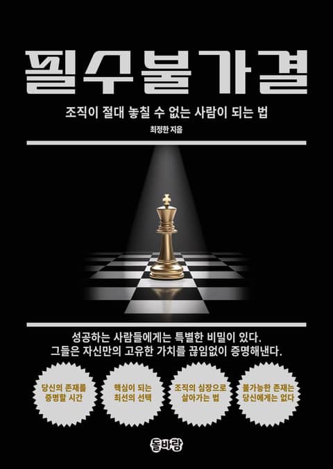 『필수불가결』은 현대 조직에서 진정한 핵심 인재가 되기 위한 실천적 지침서이다. 오랜 기간 다양한 조직의 혁신과 성장을 연구해온 저자는 인공지능과 자동화 시대에 더욱 중요해지는 인재의 조건을 체계적으로 분석한다. 단순히 기술을 습득하는 차원을 넘어, 창의적 문제해결 능력, 변화 주도력, 그리고 감성 지능을 갖춘 인재로 성장하는 구체적인 방법론을 제시한다. 이 책은 조직과 개인이 함께 성장하는 선순환 구조를 만들어가는 전략을 담아, 미래 조직의 필수불가결한 인재가 되고자 하는 모든 이들에게 실질적인 나침반이 될 것이다.
